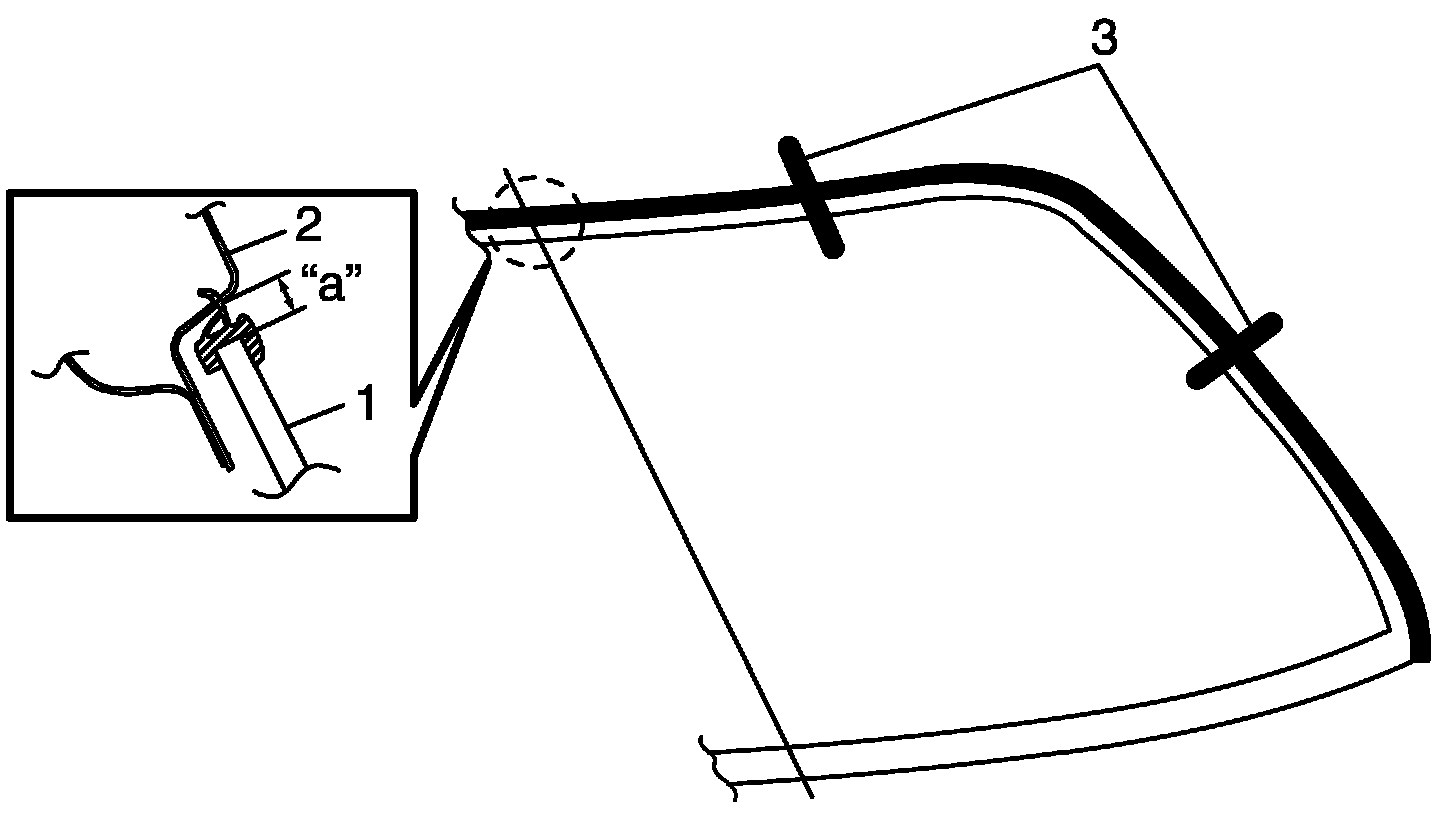 2. Install new glass stoppers (1) (2 pieces) to lower side of windshield (2) as shown.