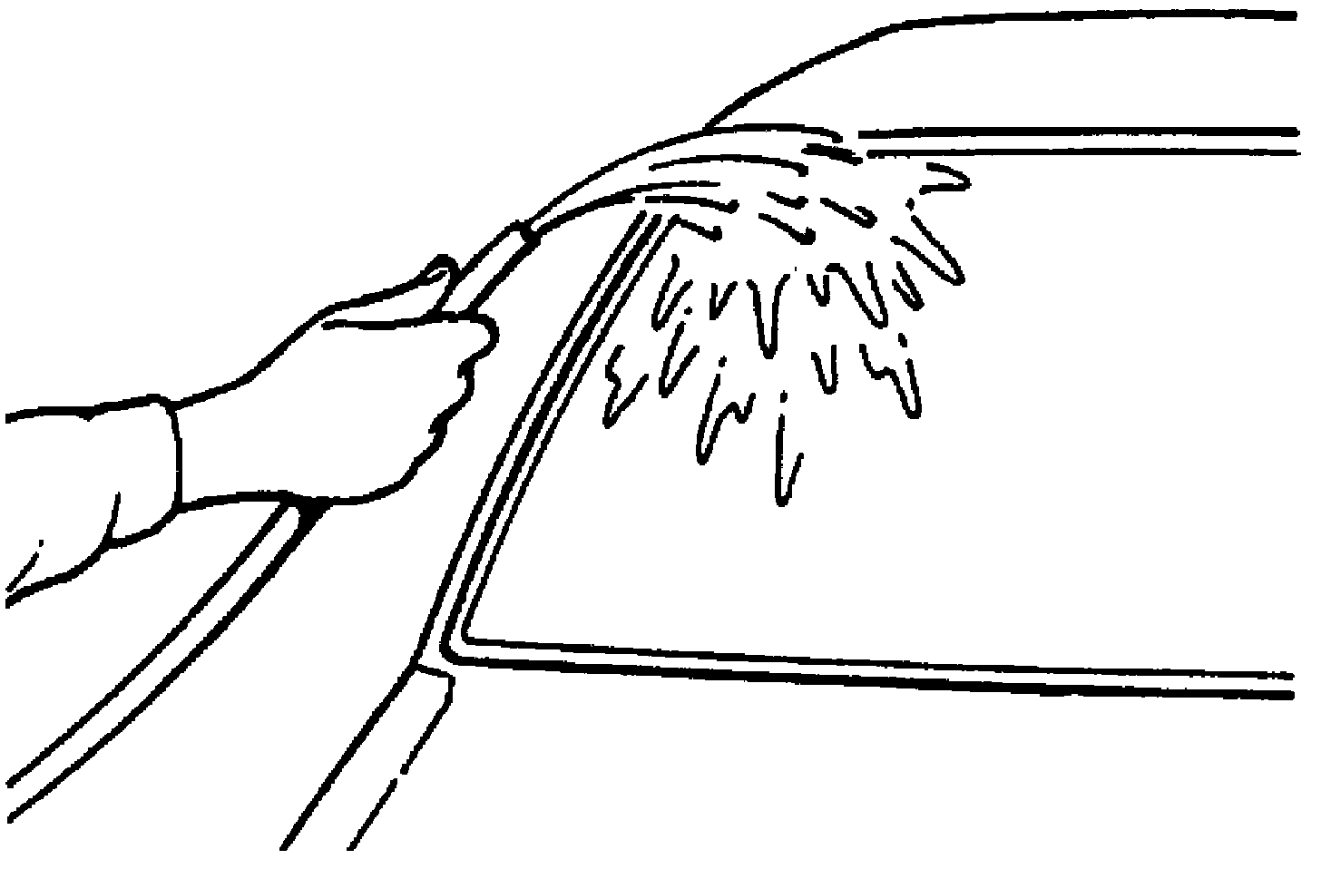 12. Check for water leakage by pouring water over windshield through hose. If leakage is found, dry windshield and fill leaky point with adhesive. If water still leaks even after that, remove glass and start installation procedure all over again.