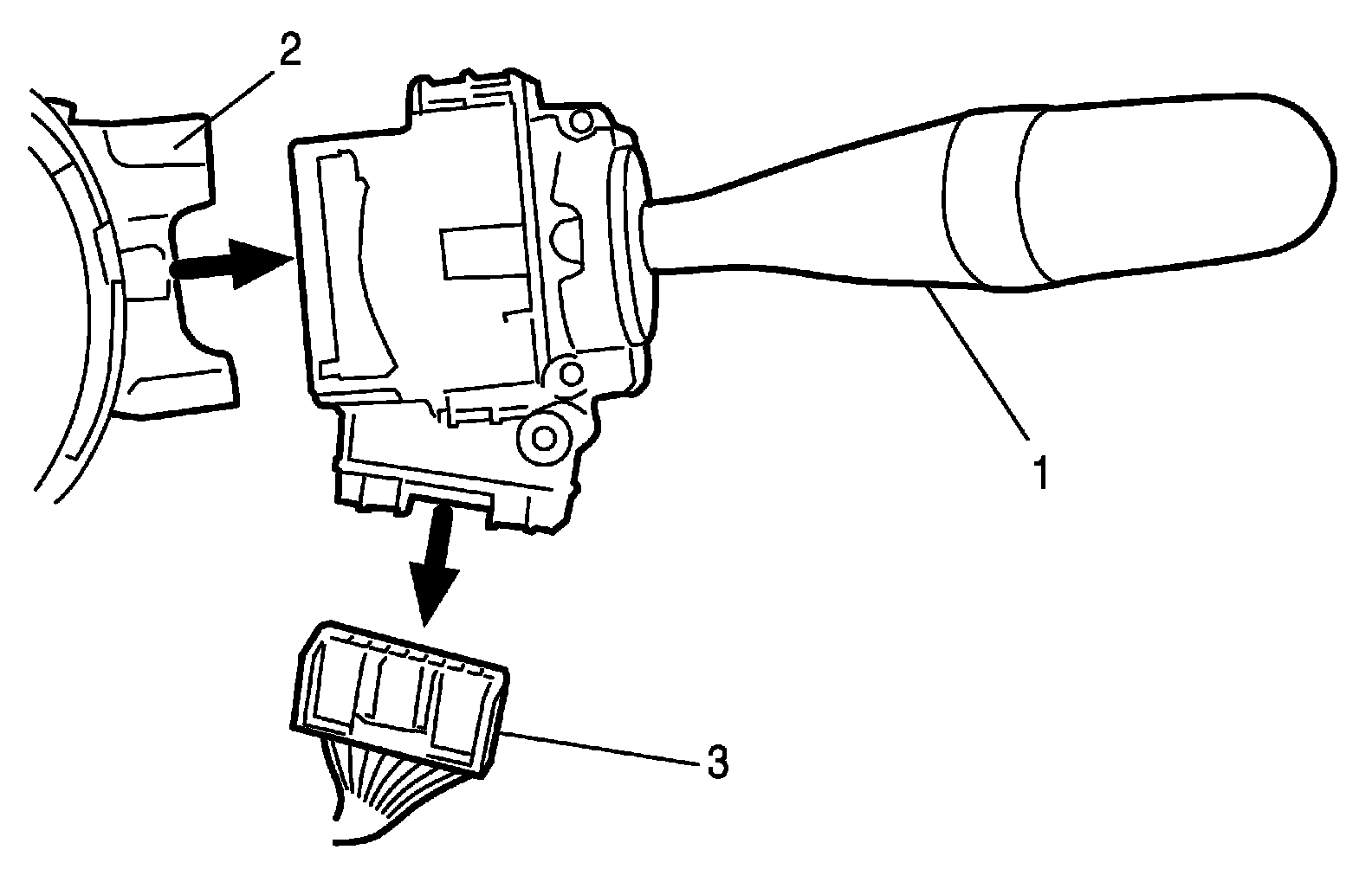 5. Remove windshield wiper and washer switch (if equipped) (1) from combination switch assembly (2) and disconnect its coupler (3).