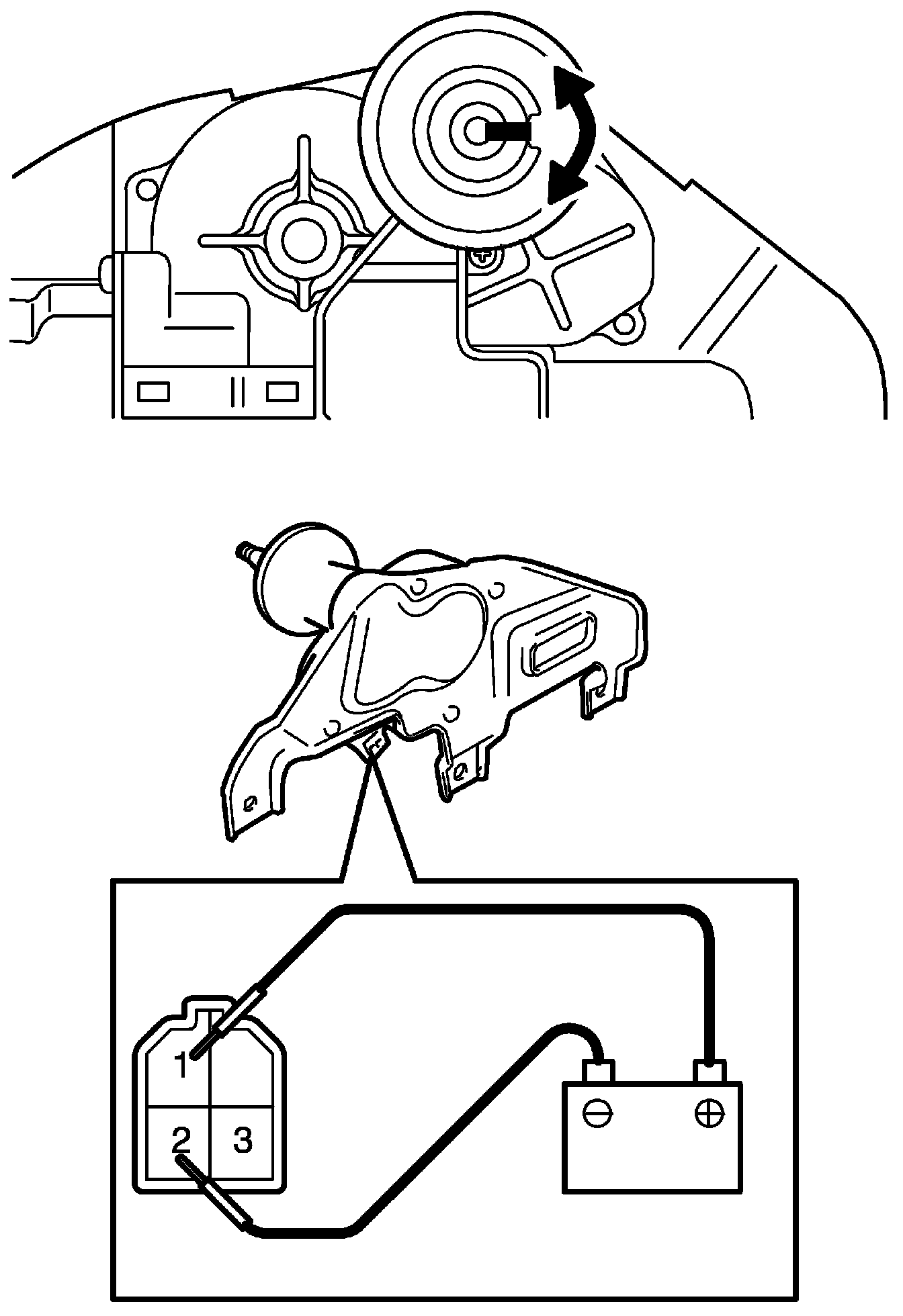 a. Connect battery positive (+) terminal to terminal "1" and its negative (-) terminal to terminal "2" and let the motor turn.