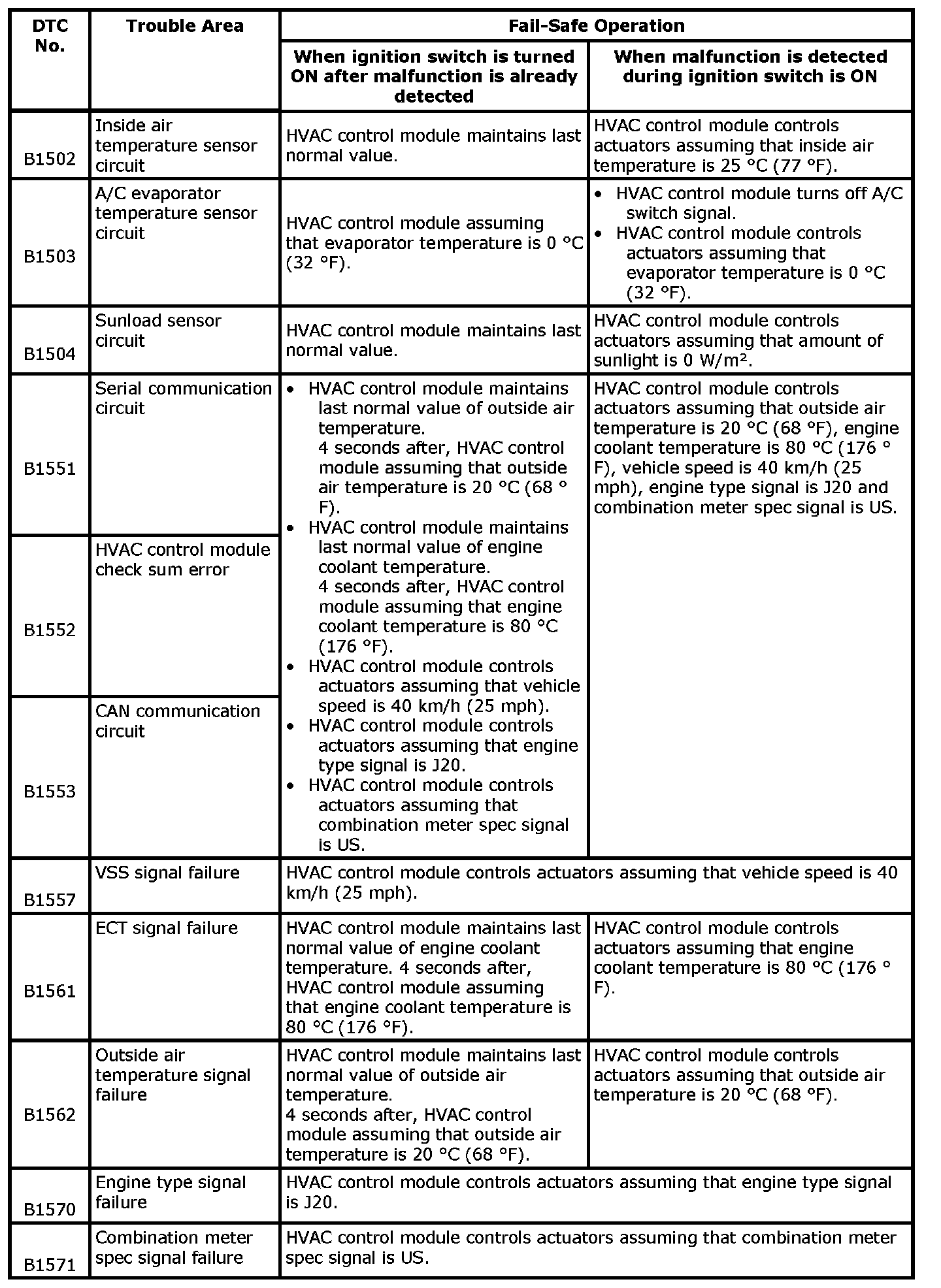 When any of the following malfunctions (DTCs) is detected, fail-safe mode is activated. However, when HVAC control module judges A/C system recovered, fail-safe mode is canceled.