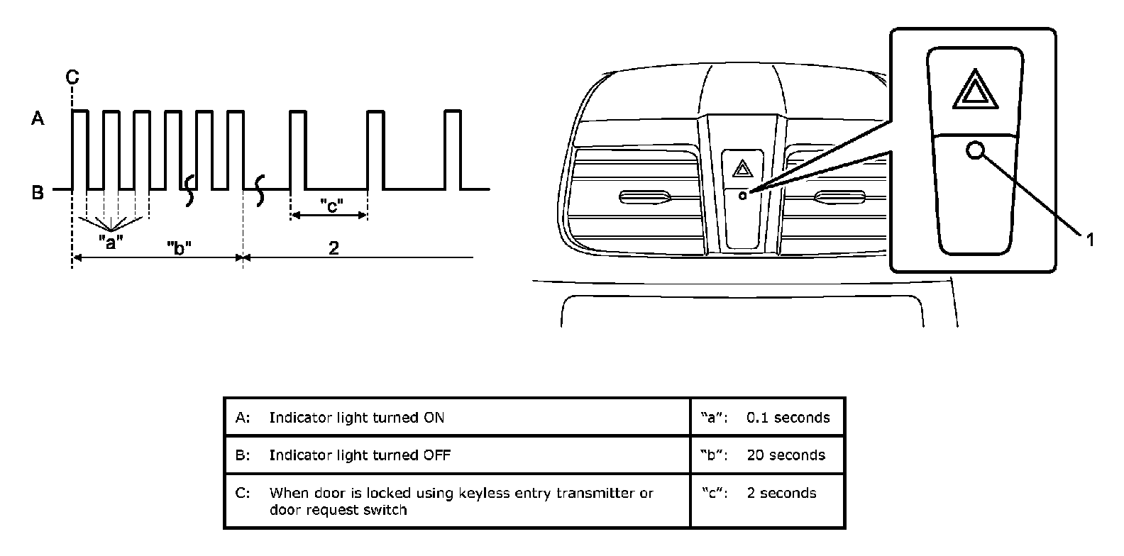 When "B" mode is selected and the door is locked using keyless entry transmitter or door request switch, the theft deterrent light (1) flashes at 0.1 second interval for 20 seconds and the security alarm system is set to the stand-by mode (2). Once it is set to the stand-by mode, the theft deterrent light blinks at 2 second intervals.