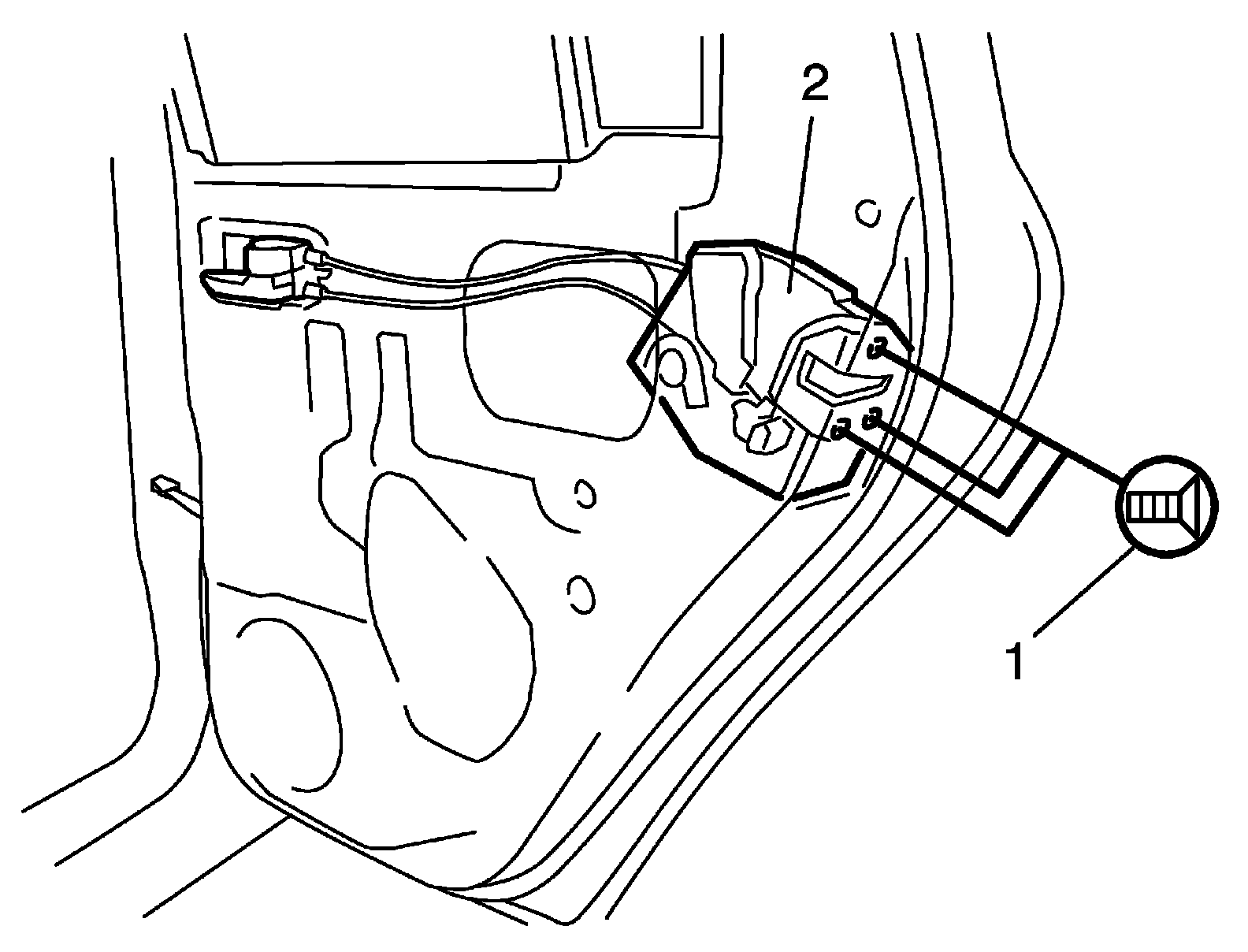 3. Remove door latch mounting screws (1) and remove door latch assembly (2).