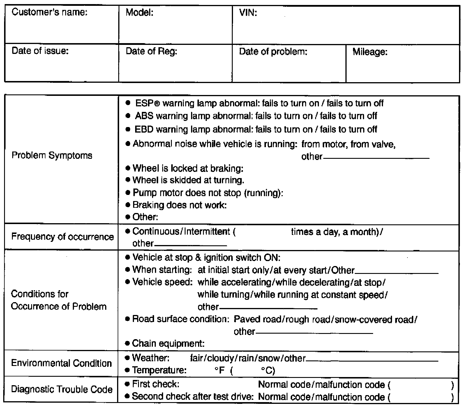 If symptom in "Customer Questionnaire" is found or reproduced in the vehicle, confirm the symptom is problem or not. (This step should be done with the customer if possible.) Check warning lights related to brake system referring to EBD Warning Light (Brake Warning Light) Check, EBD Warning Light (Brake Warning Light) Check ABS Warning Light Check ABS Warning Light Check and ESP(R) Warning Light Check. ESP(R) Warning Light Check