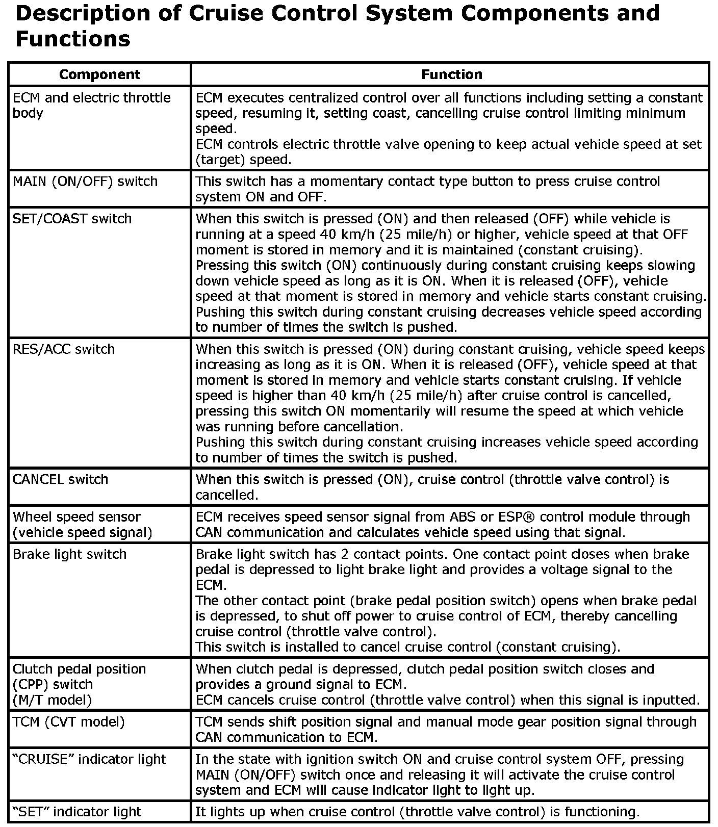 Description of Cruise Control System Components and Functions