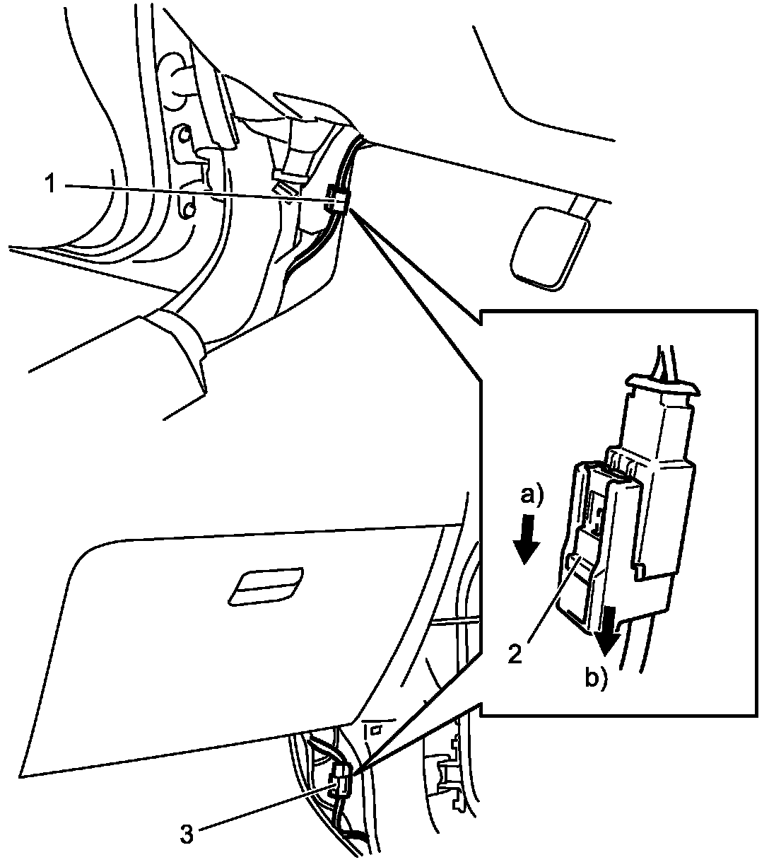 6. Remove passenger side front pillar lower trim and disconnect yellow connector (3) for passenger air bag as follows.