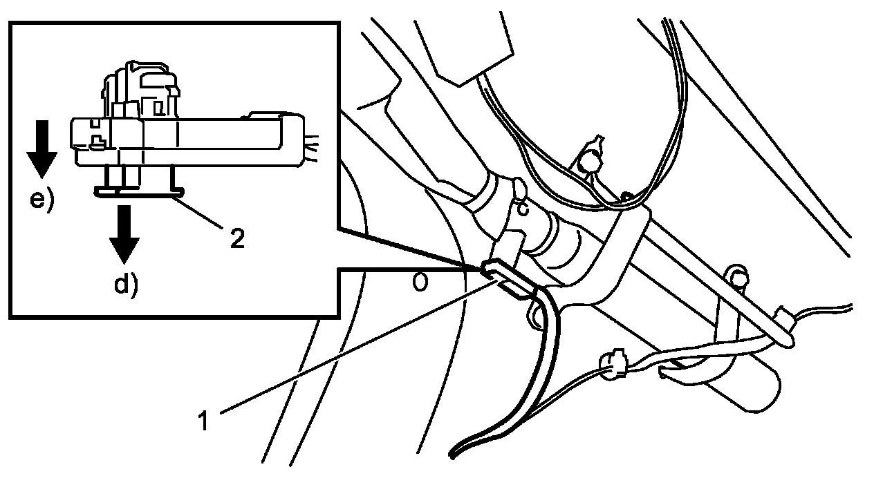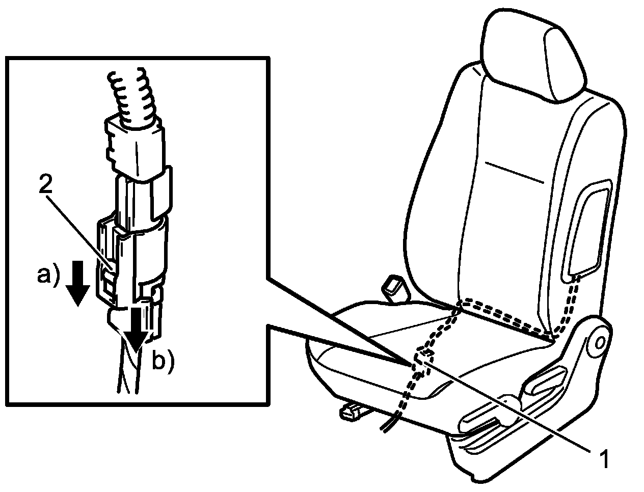 7. Disconnect yellow connector of side-air bag (inflator) module under front seat cushion (1).
