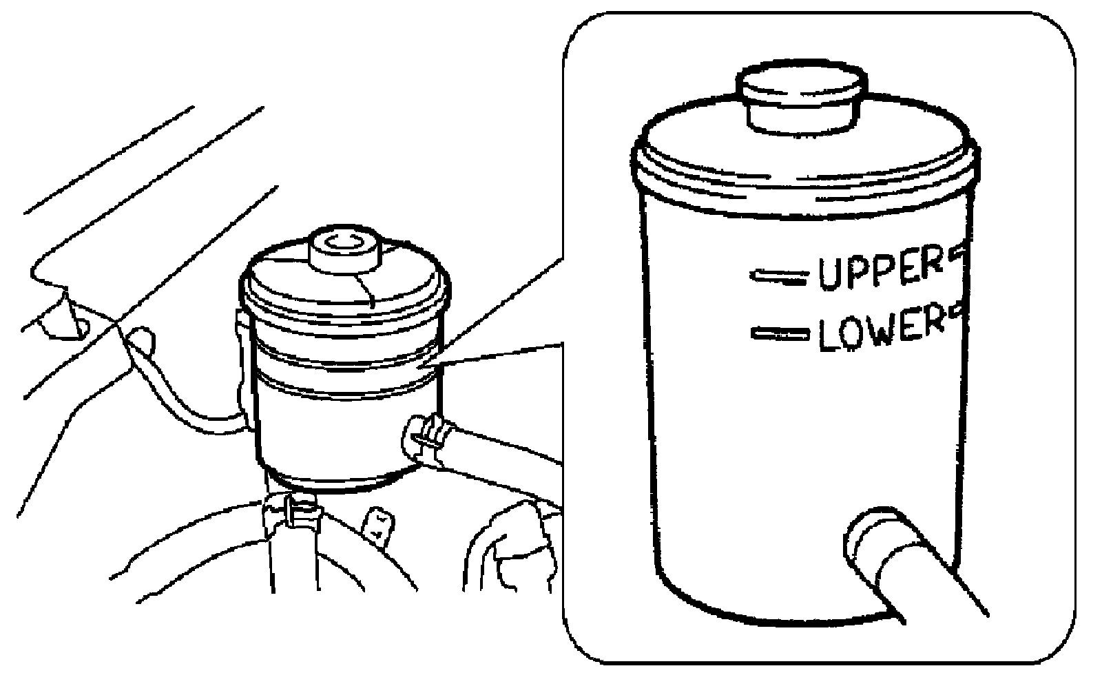 P/S Fluid Level CheckWith engine stopped, check fluid level indicated on P/S fluid reservoir, which should be between "UPPER" and "LOWER" marks. If it is lower than "LOWER" mark, fill fluid up to "UPPER" mark.