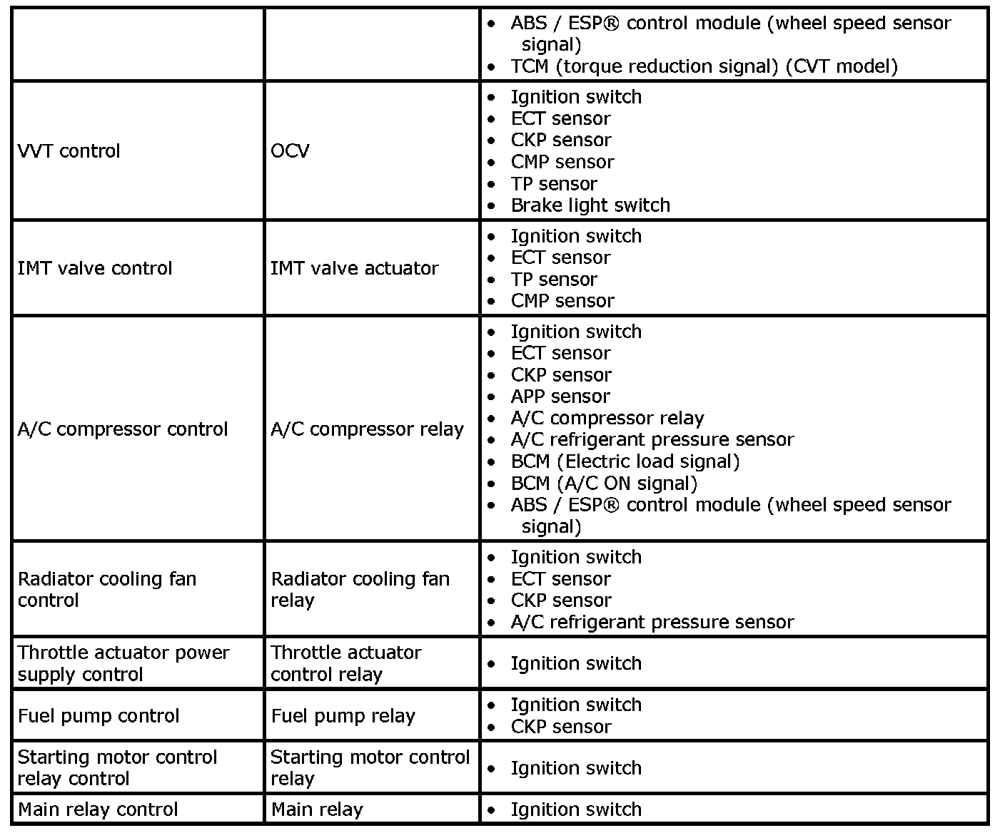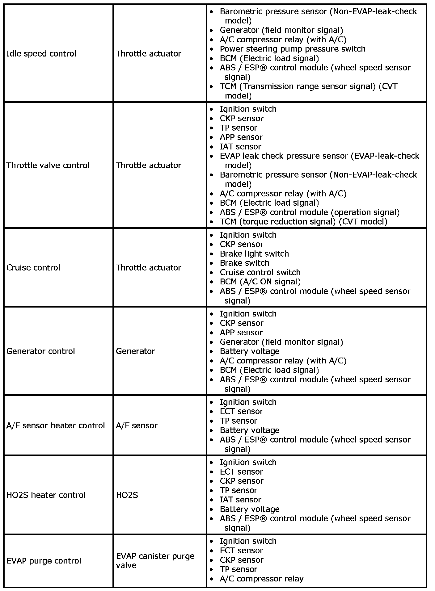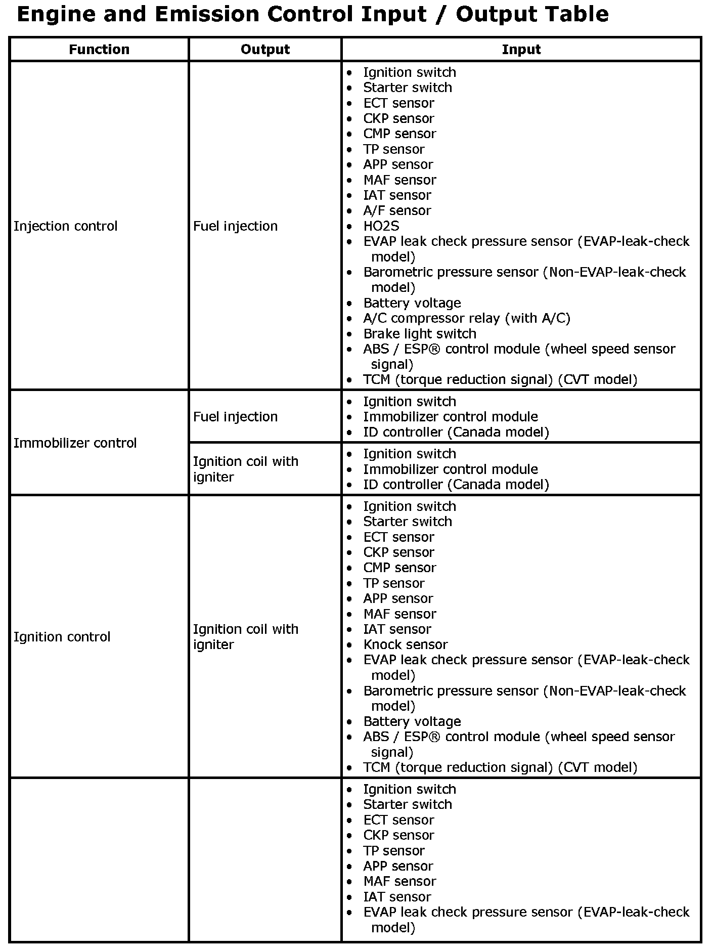 Engine and Emission Control Input / Output TableEngine and Emission Control Input / Output Table (Part 1):