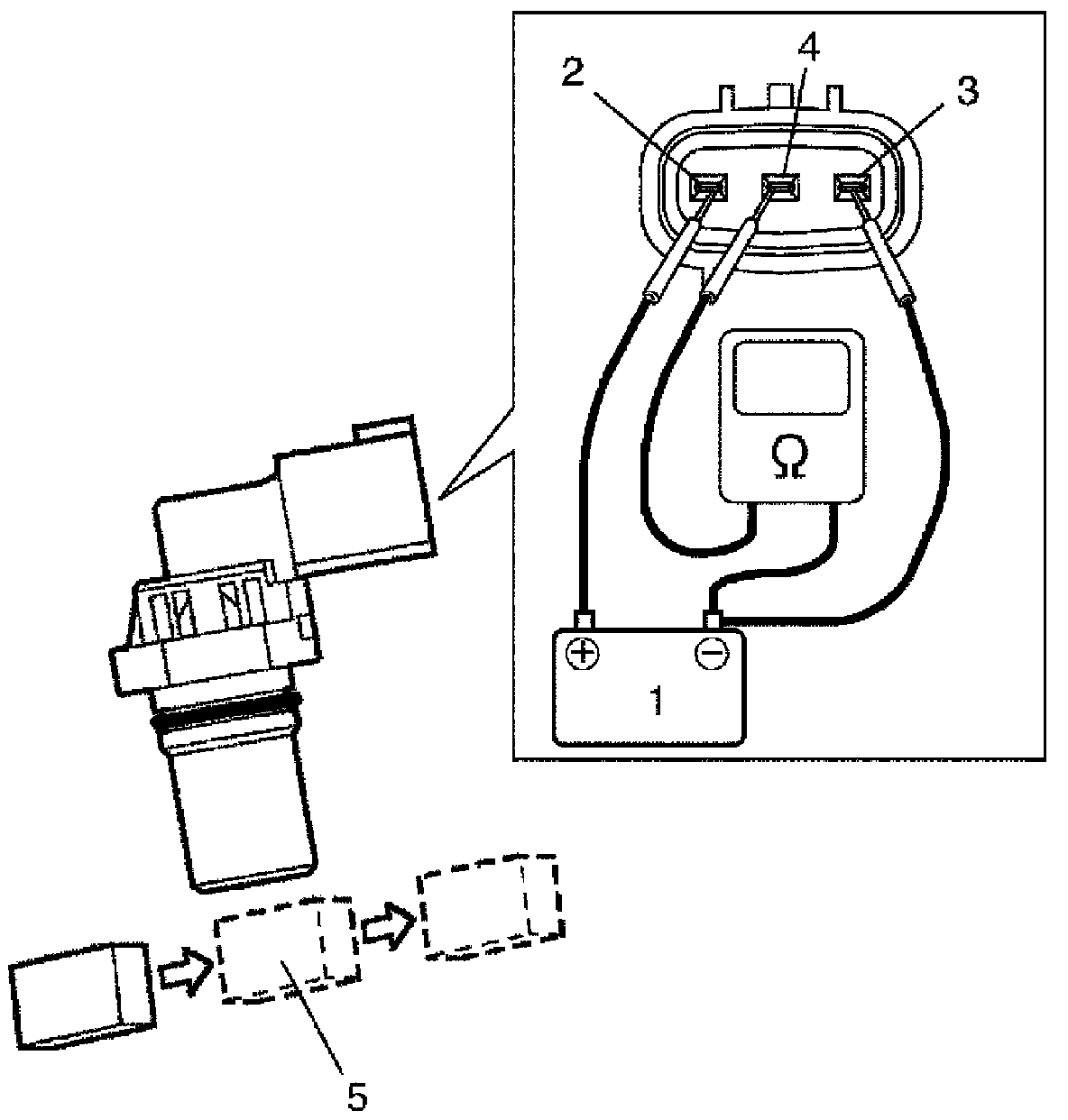2. Arrange 12 V battery (1) and connect its positive terminal to "Vin" terminal (2) and negative terminal to "Ground" terminal (3) of sensor. Then using ohmmeter, measure resistance between "Vout" terminal (4) of sensor and negative terminal of battery by passing magnetic substance (iron) (5) while keeping approximately 1 mm (0.03 in.) gap with respect to end face of CMP sensor.