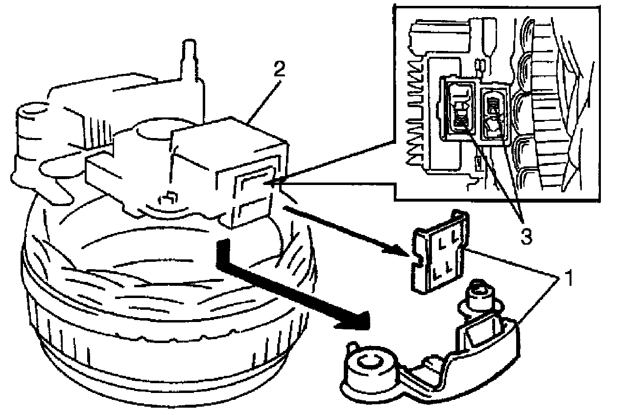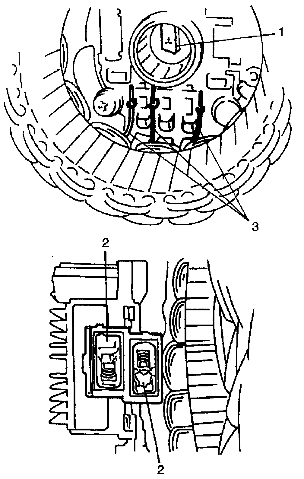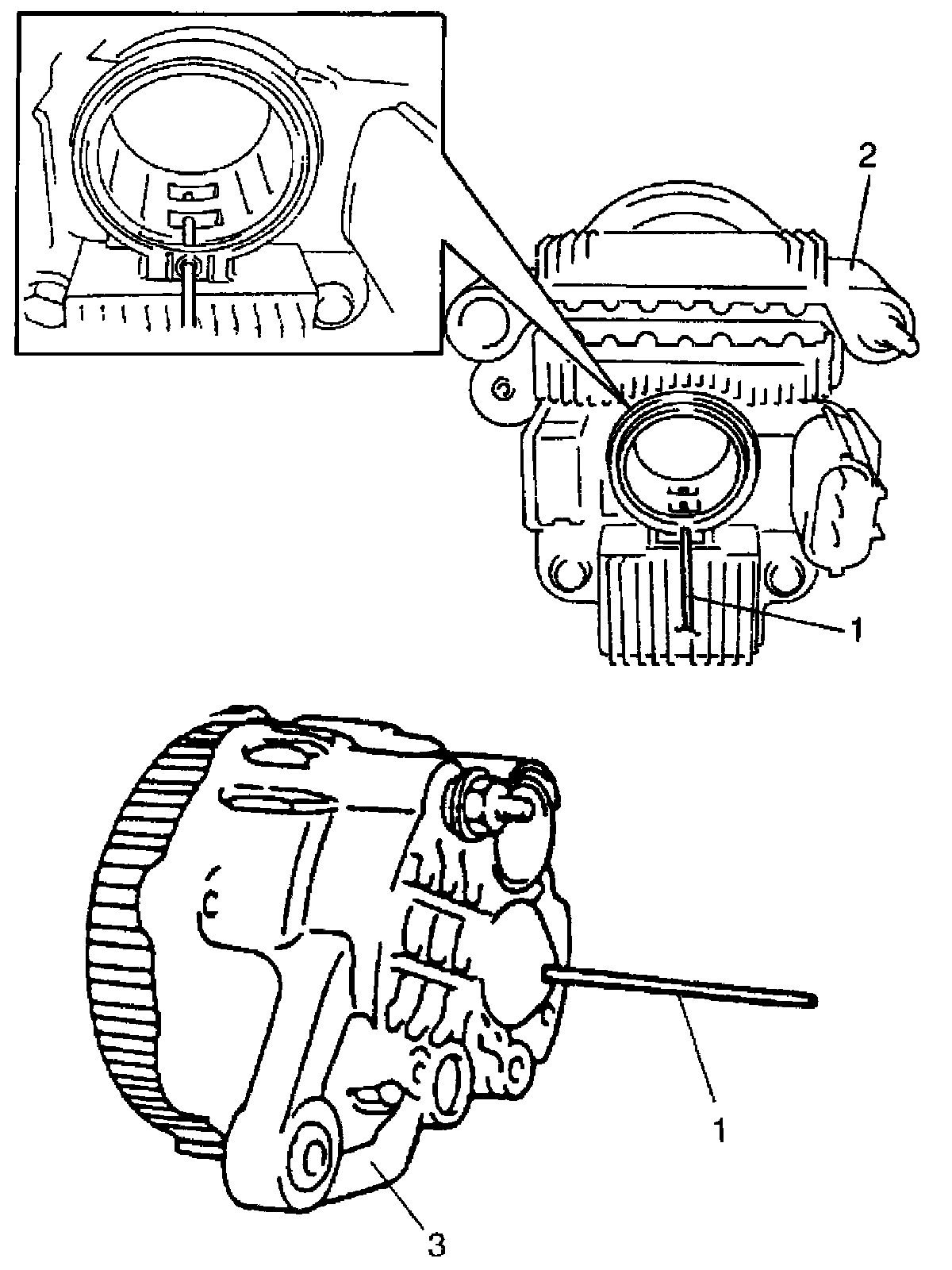 - Push brushes into brush holder, then support brushes by inserting appropriate wire (1) before installing IC regulator assembly (2) to rear end frame (3).