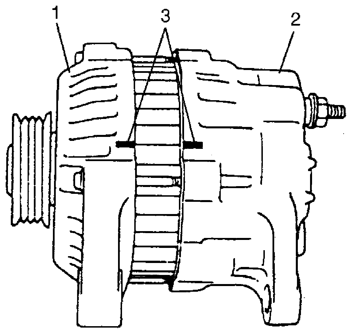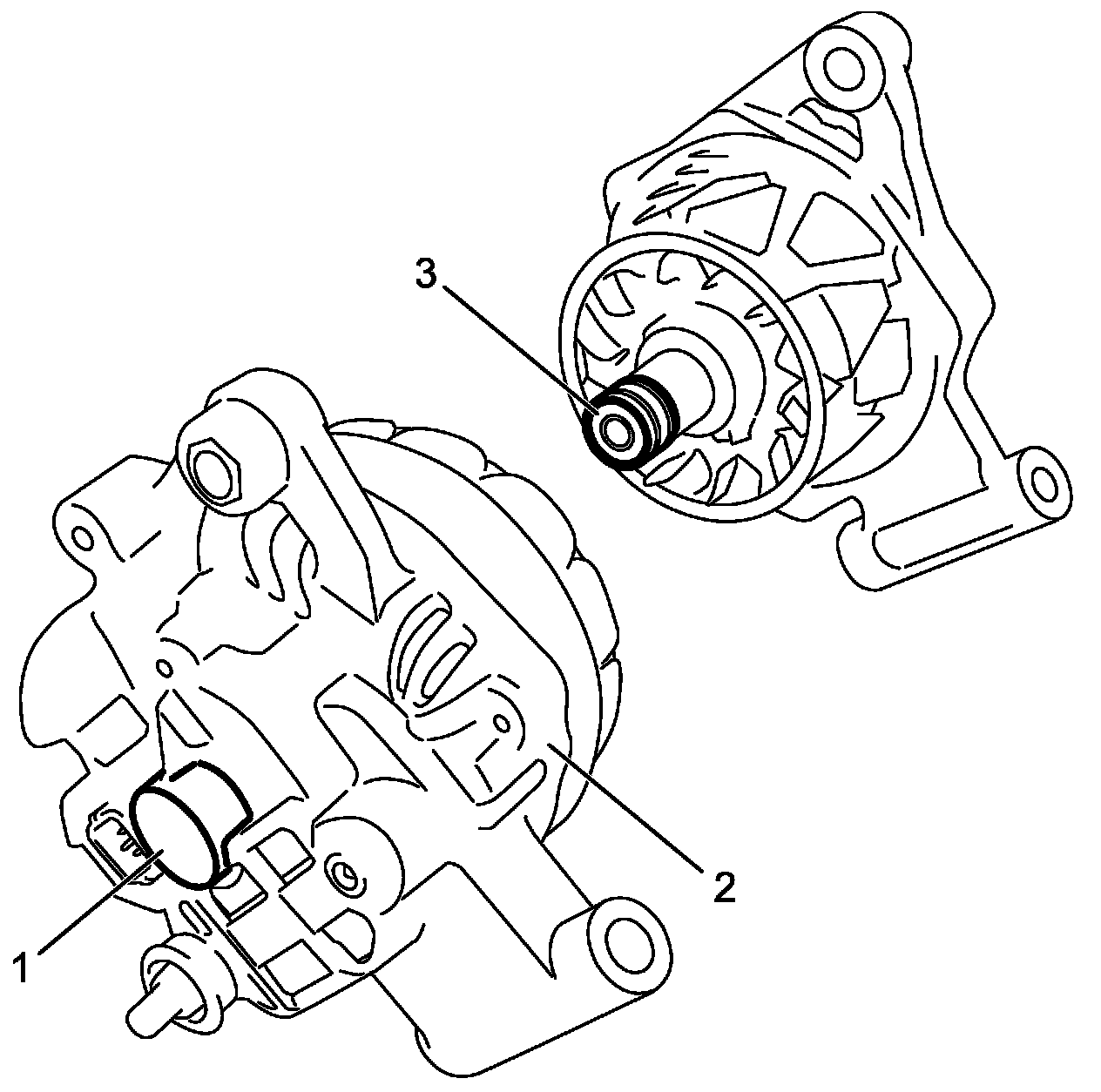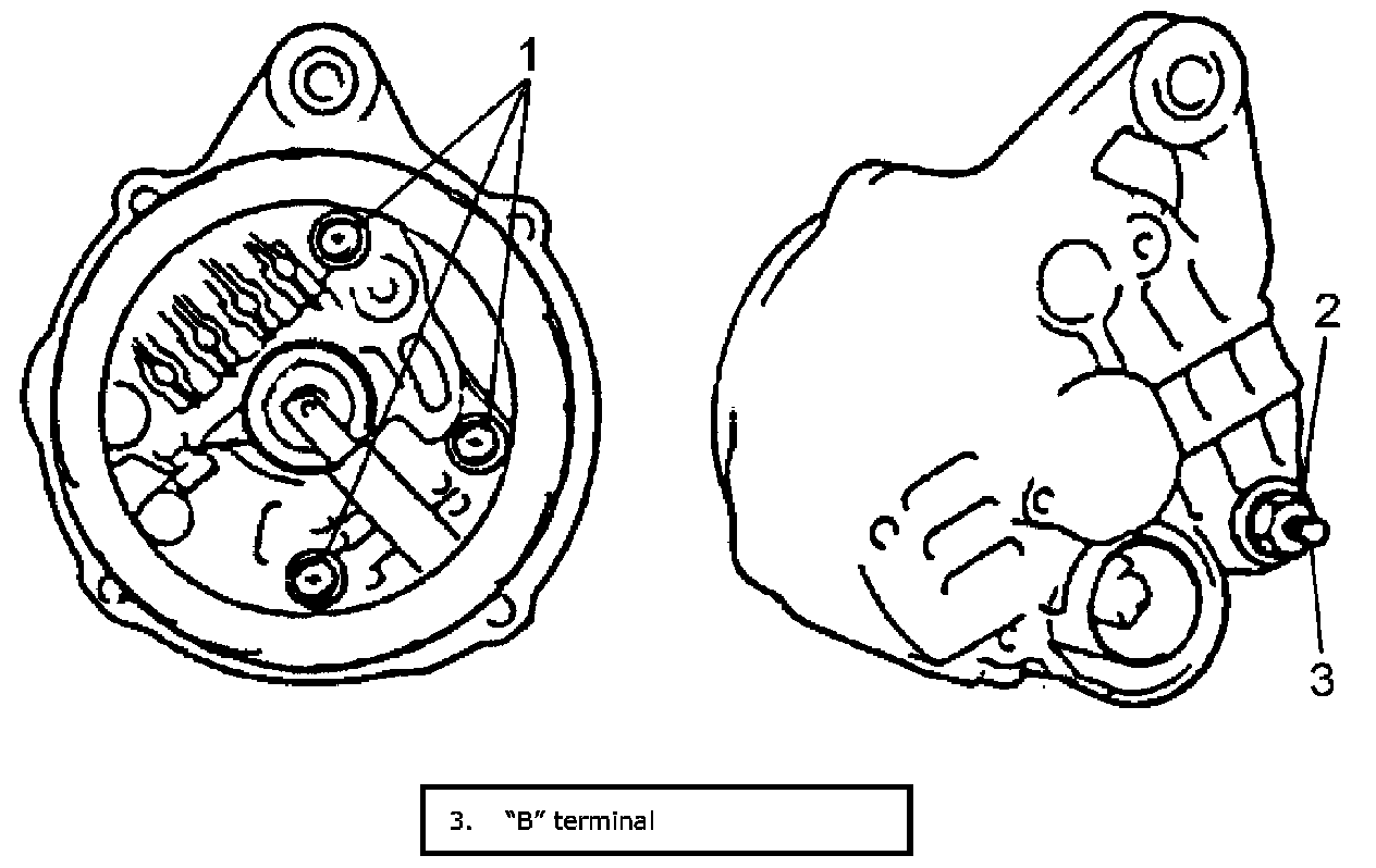 - Push brushes into brush holder, then support brushes by inserting appropriate wire (1) before installing IC regulator assembly (2) to rear end frame (3).