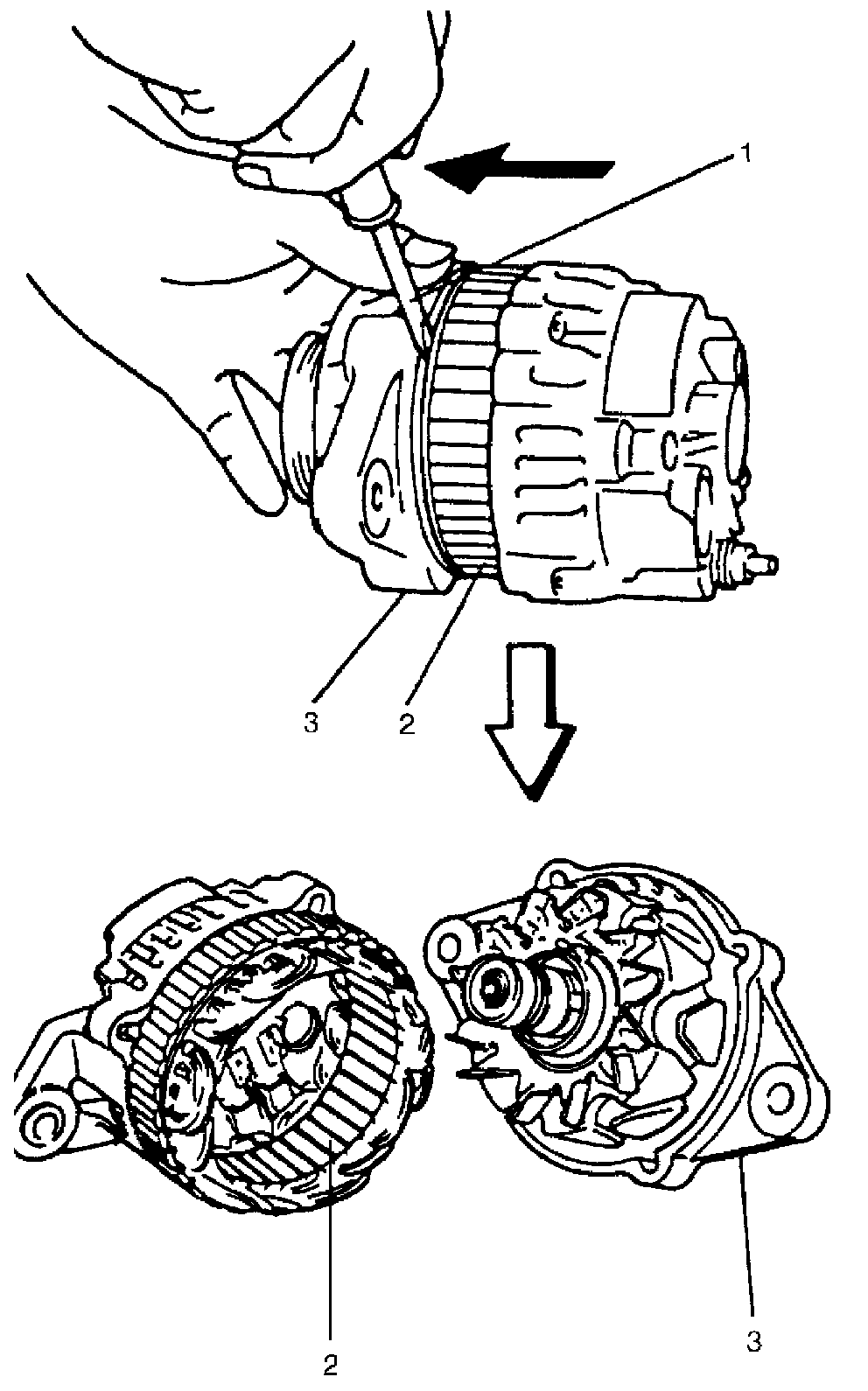 3. With lever (1) inserted between stator core (2) and drive end frame (3), separate generator into drive end frame (3) and rear side.