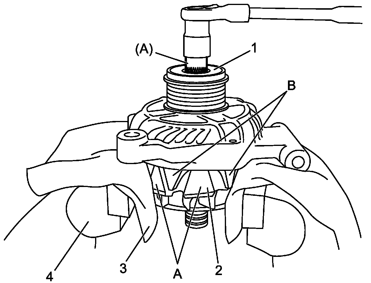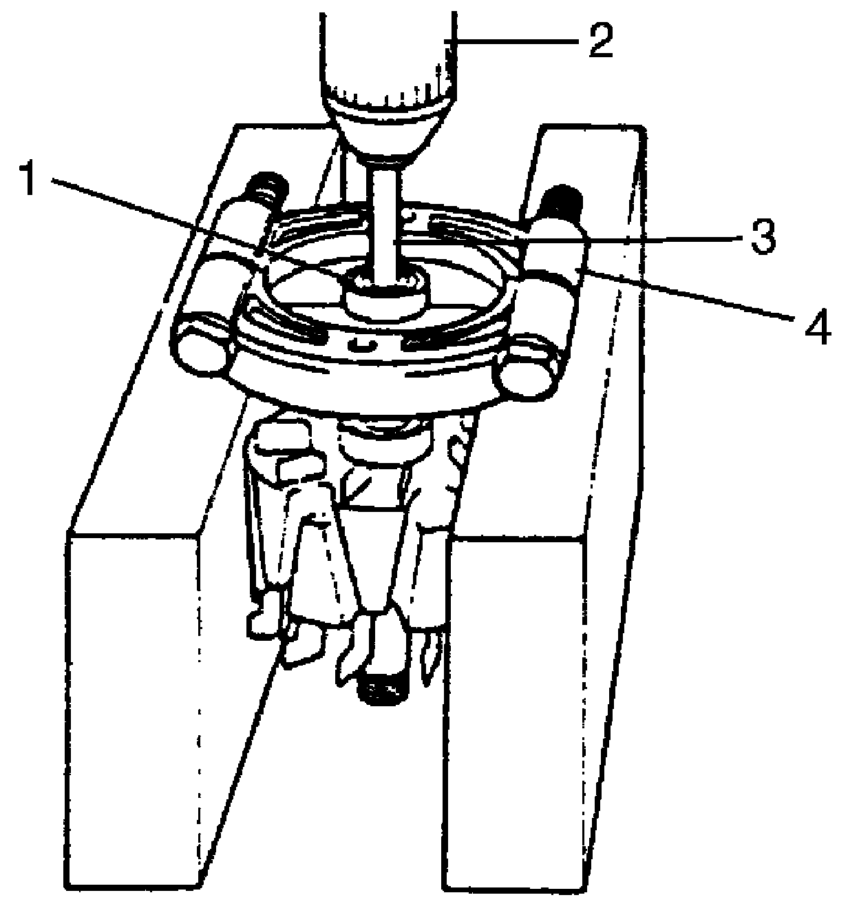 8. Remove rear end bearing (1) using hydraulic press (2), general rod (3) and general tool (4).
