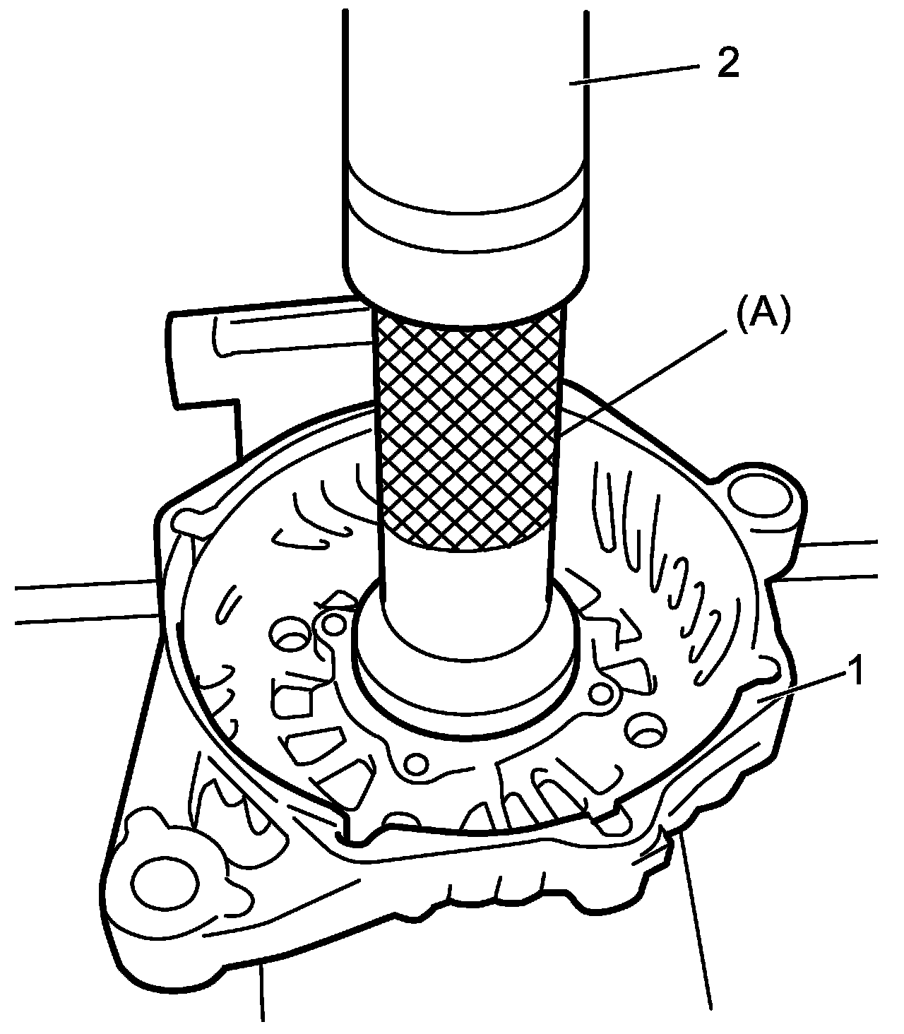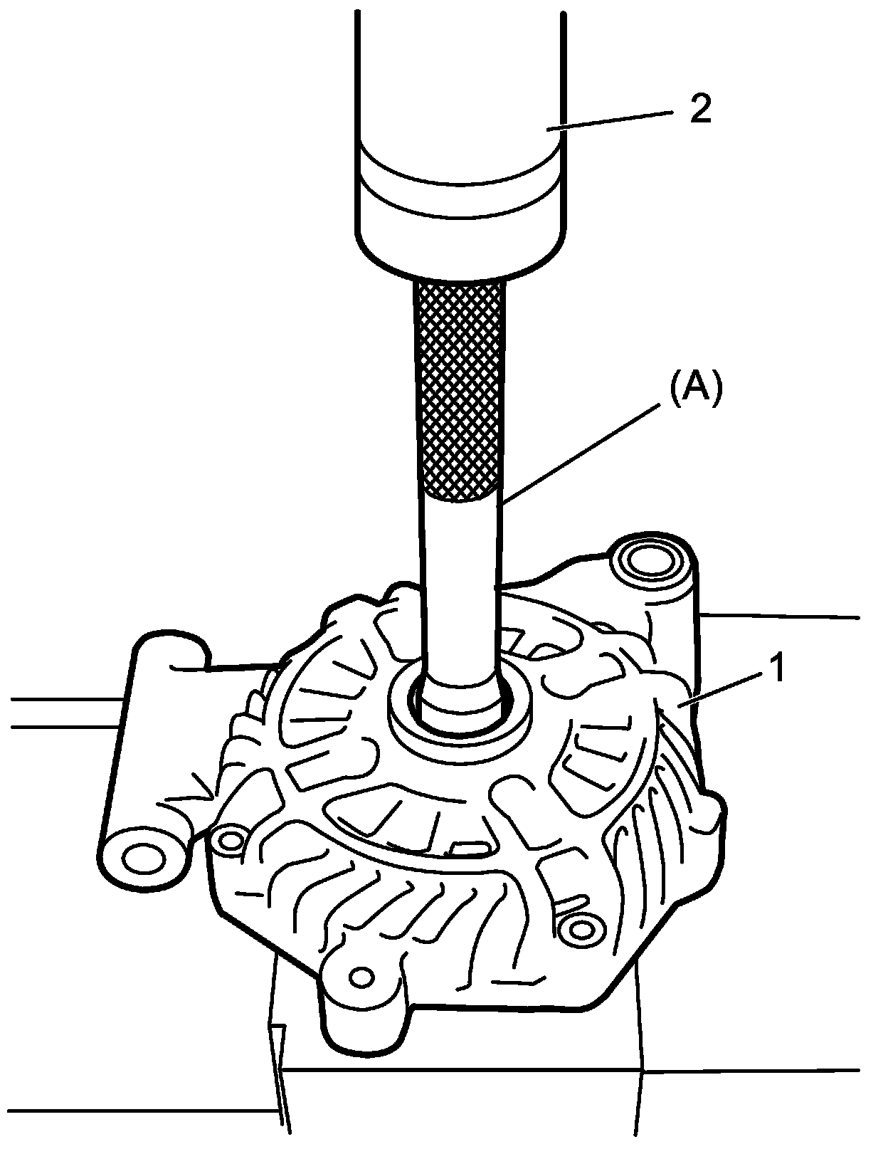 - Install drive end bearing to drive end frame (1) using special tool and hydraulic press (2).