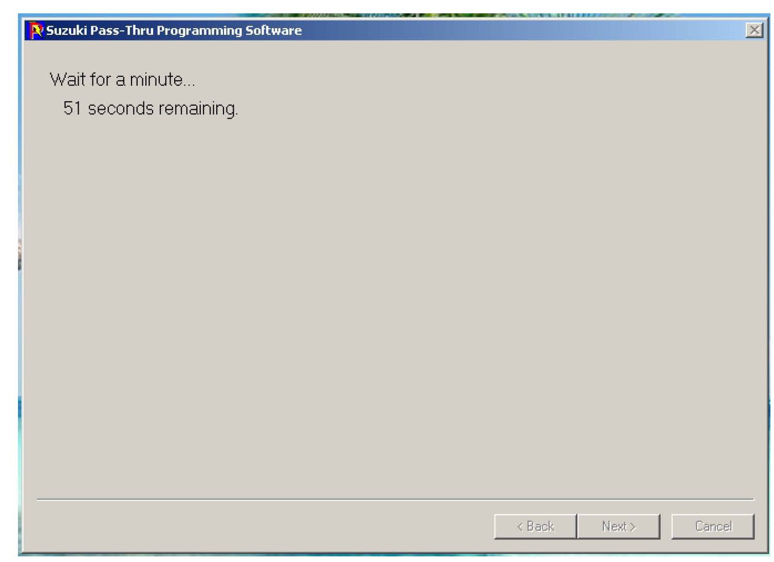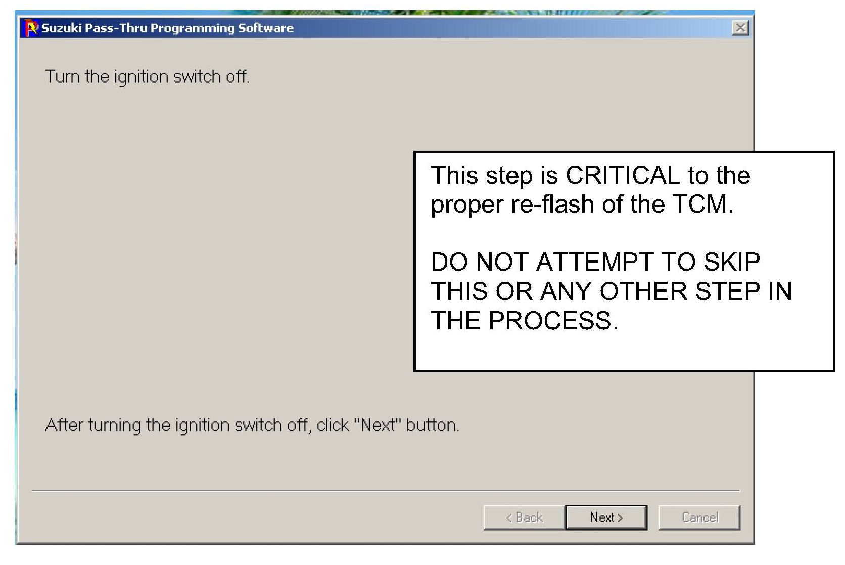 13. Once the data transfer is complete the program requires that the ignition be turned off for a minimum time period of one minute. Once the vehicle is turned off, click the "Next" button.