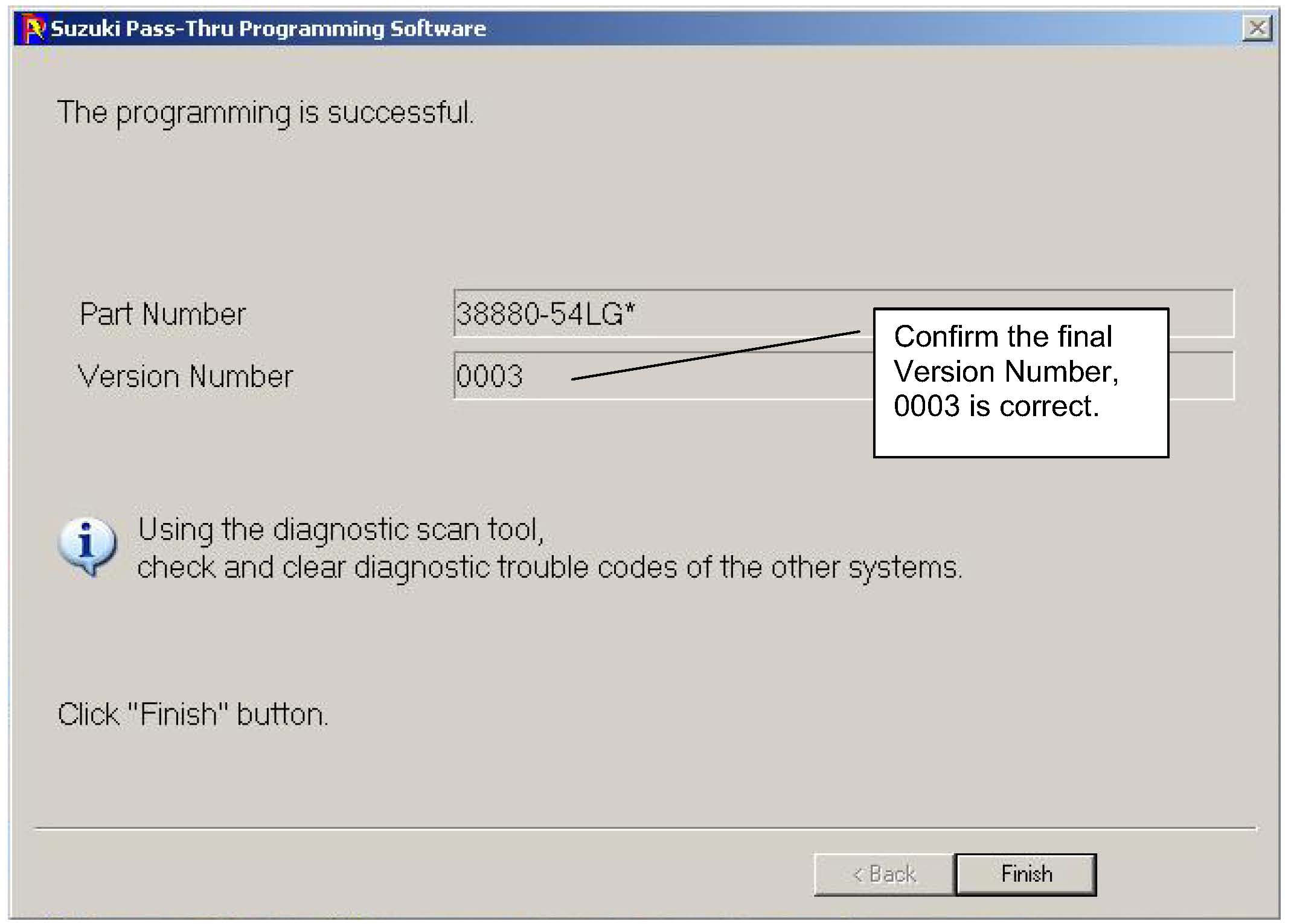 16. The final screen is now displayed indicating that the programming was successful, and also the summary of the new TCM parameters. Click "Finish"