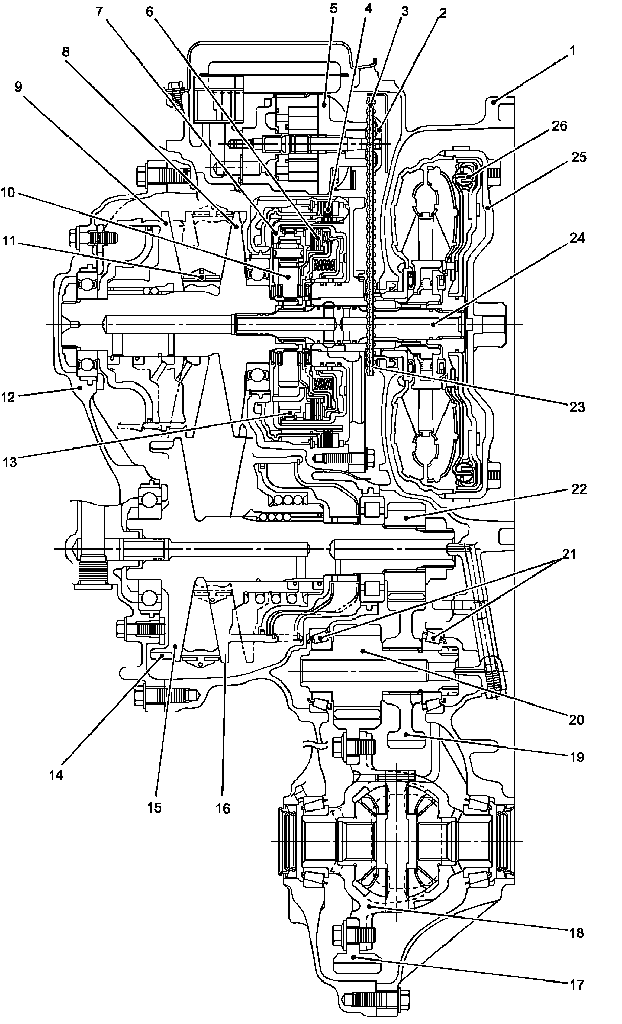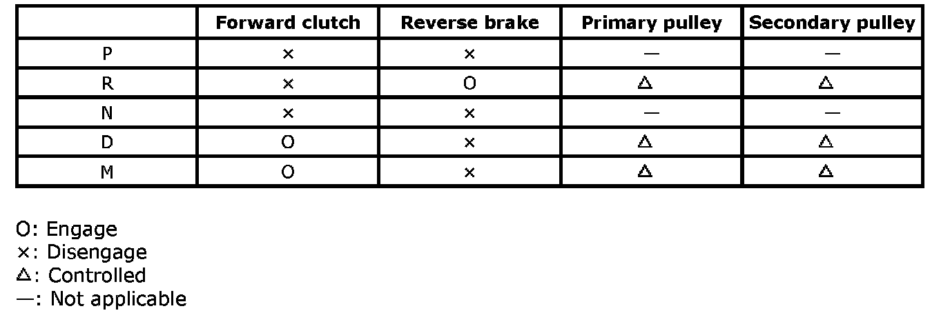 This transaxle is an electronic control fully automatic transaxle with forward continuously variable and reverse 1-speed.