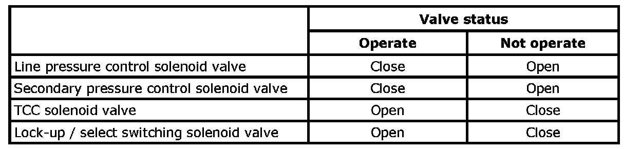 When the vehicle speed exceeds the specified value, the TCC solenoid valve completely engages the TCC upon control signal from TCM. This control helps to improve the transaxle efficiency.