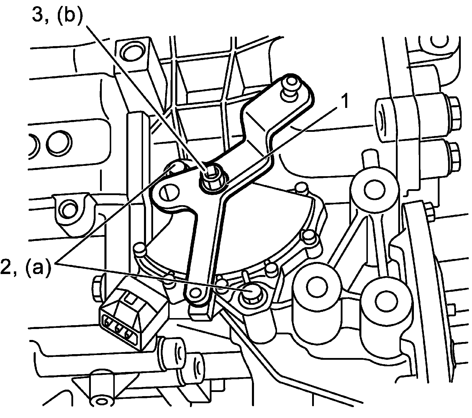 ^ Tighten transmission range sensor bolts (2) and new manual select lever nut (3) to specified torque.