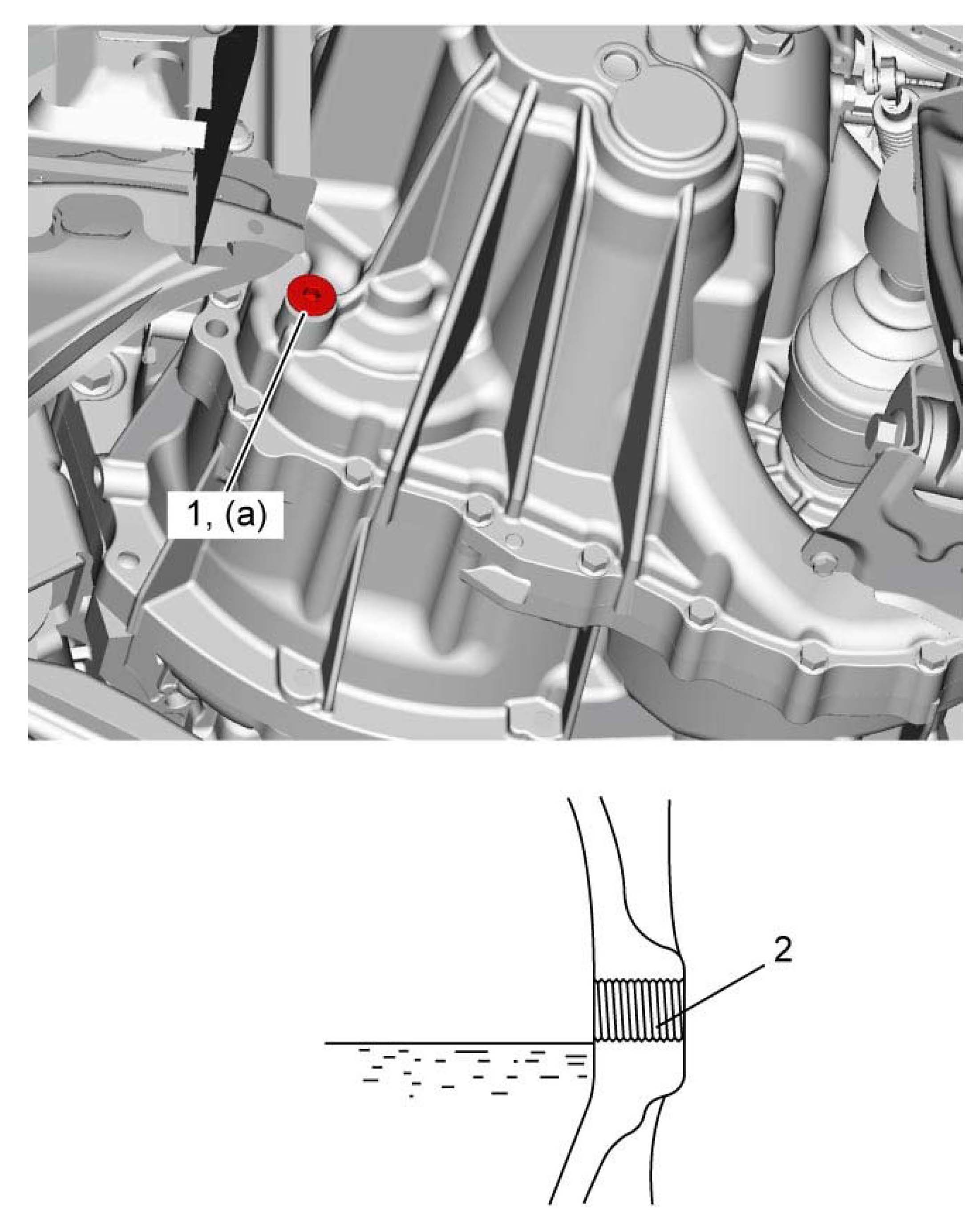 3) Remove transaxle oil level / filler plug (1) and gasket, and confirm oil flow from oil level / filler plug hole (2). If oil does not flow, pour specified oil until a little oil flow from oil level / filler plug hole.