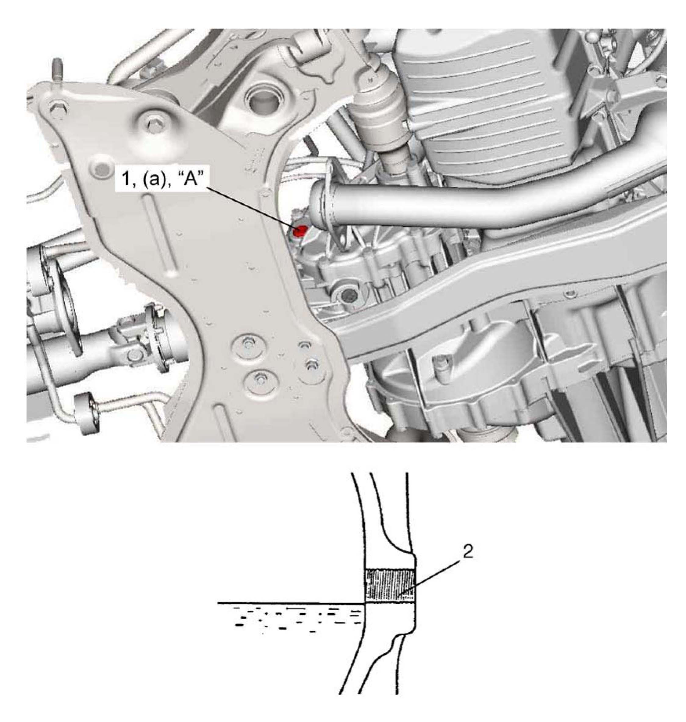 3) Remove transfer oil level / filler plug (1) and check oil for contamination and level. Oil should flow out of plug hole (2) or oil level should reach plug hole (2).