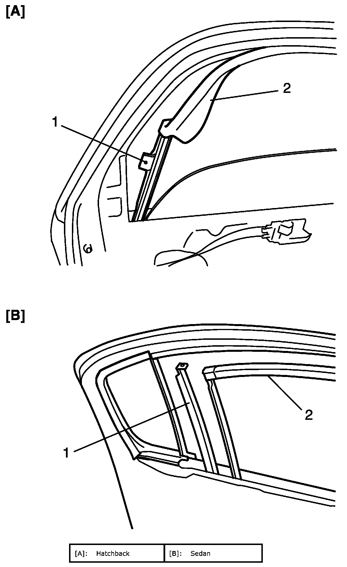 10. Remove rear door partition glass (1) with rear door partition weather-strip (2) (Sedan).