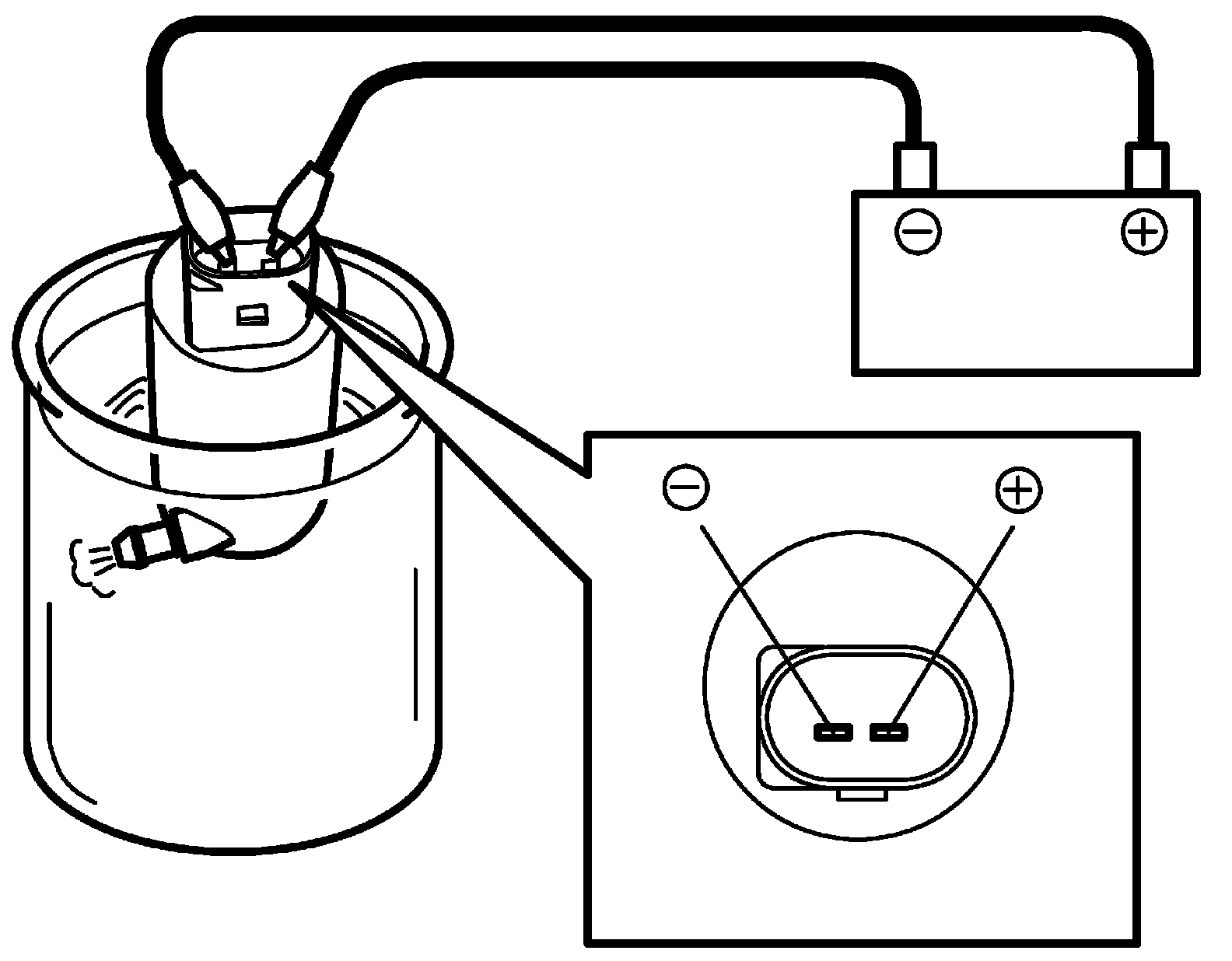 Washer Pump Inspection1. Connect battery positive (+) and negative (-) terminals to pump (+) and (-) terminals respectively.