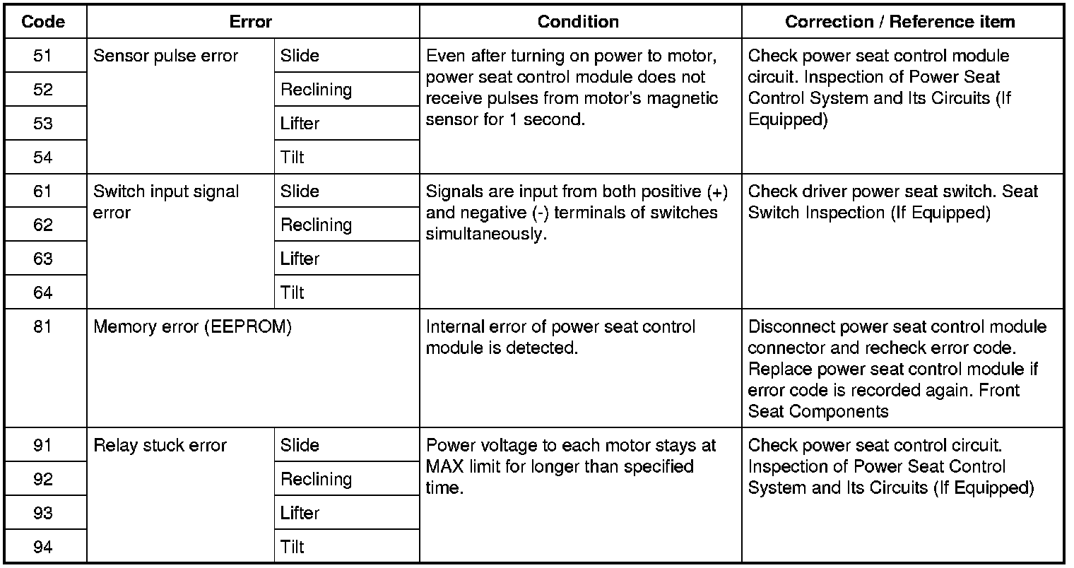 Power seat control module monitors all input and output signals from/to the power seat control system devices. If control module detects any faults in these signals, it records the contents of these faults in memory as error codes. Recorded error codes can be retrieved in the form of buzzer beeps if control module is set to the diagnosis mode. Diagnosis mode also allows monitoring incoming signals to the control module.