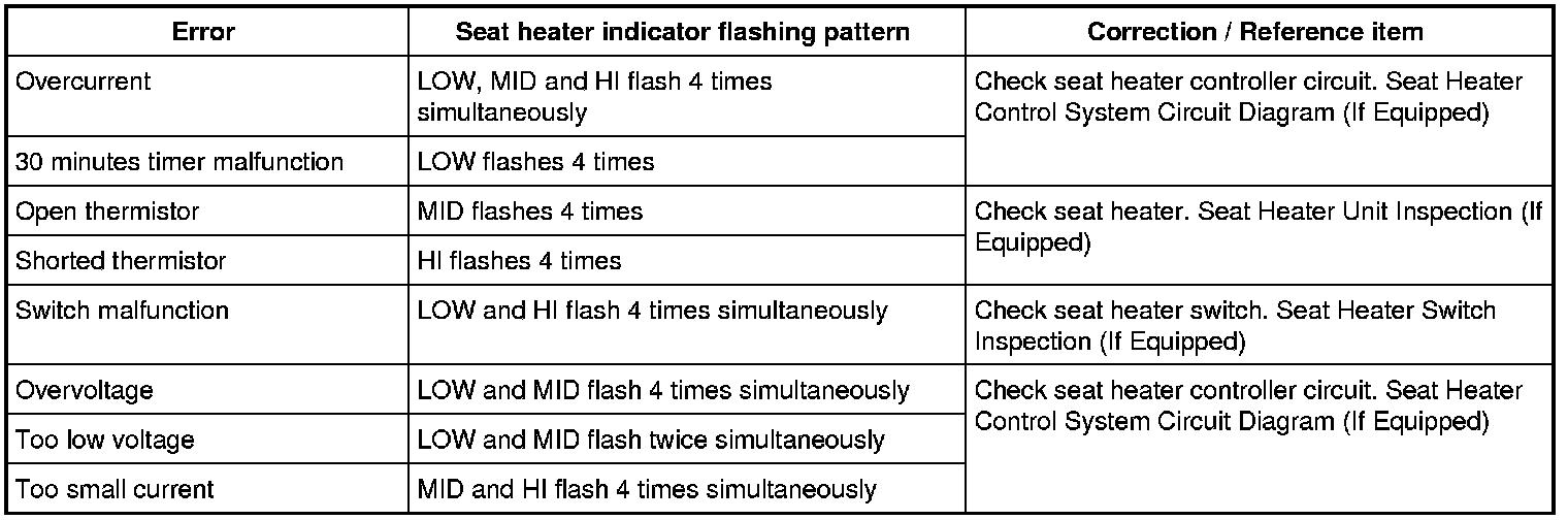 5) If error codes are present, seat heater indicator(s) will start indicating these codes 2 seconds later by flashing in specific patterns. Each code is repeatedly indicated at 2-second intervals as long as diagnosis mode lasts. If 2 or more codes are recorded, they are all indicated one after another in the predetermined priority order (an item has priority over any item listed below in the following diagnosis item table) at 2-second intervals.