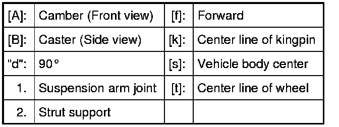 Camber, caster and kingpin inclination angle are not adjustable. If they are out of specification, check vehicle body or replace related part.