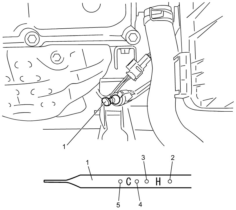 8) With engine idling and A/C switch turned off, pull out fluid level gauge (1), wipe it off with lint-free paper towel and put it back into place.