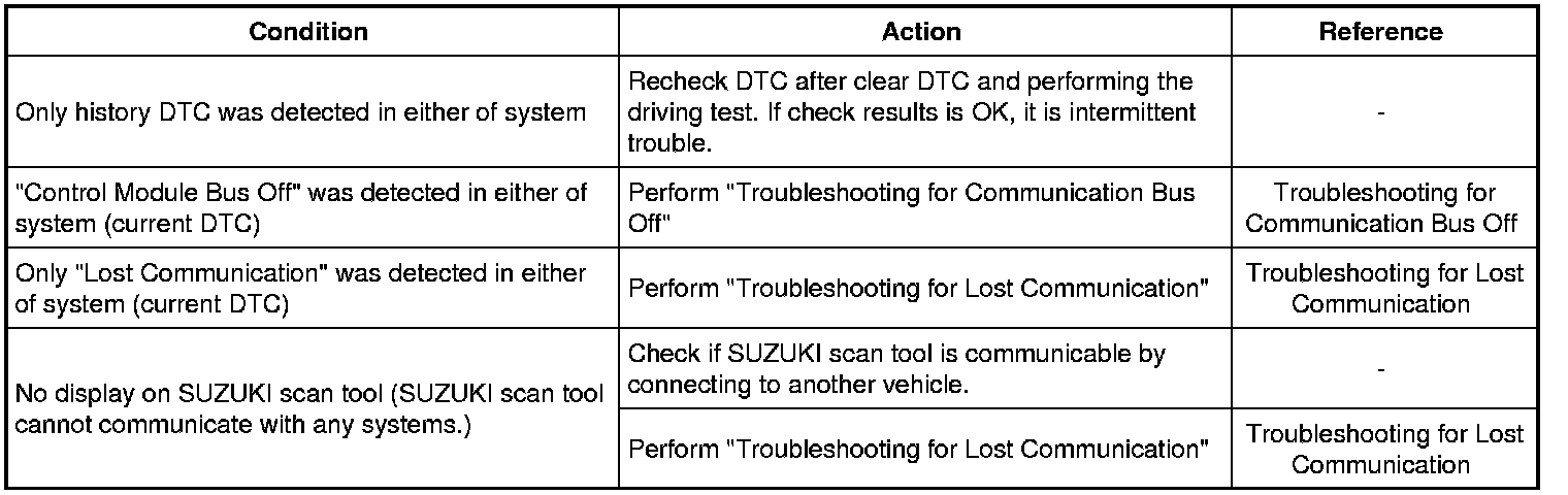 Using SUZUKI scan tool, execute "Communication Malfunction DTC" under "Bus check" and check DTCs of all control modules connected to CAN Communication Bus.