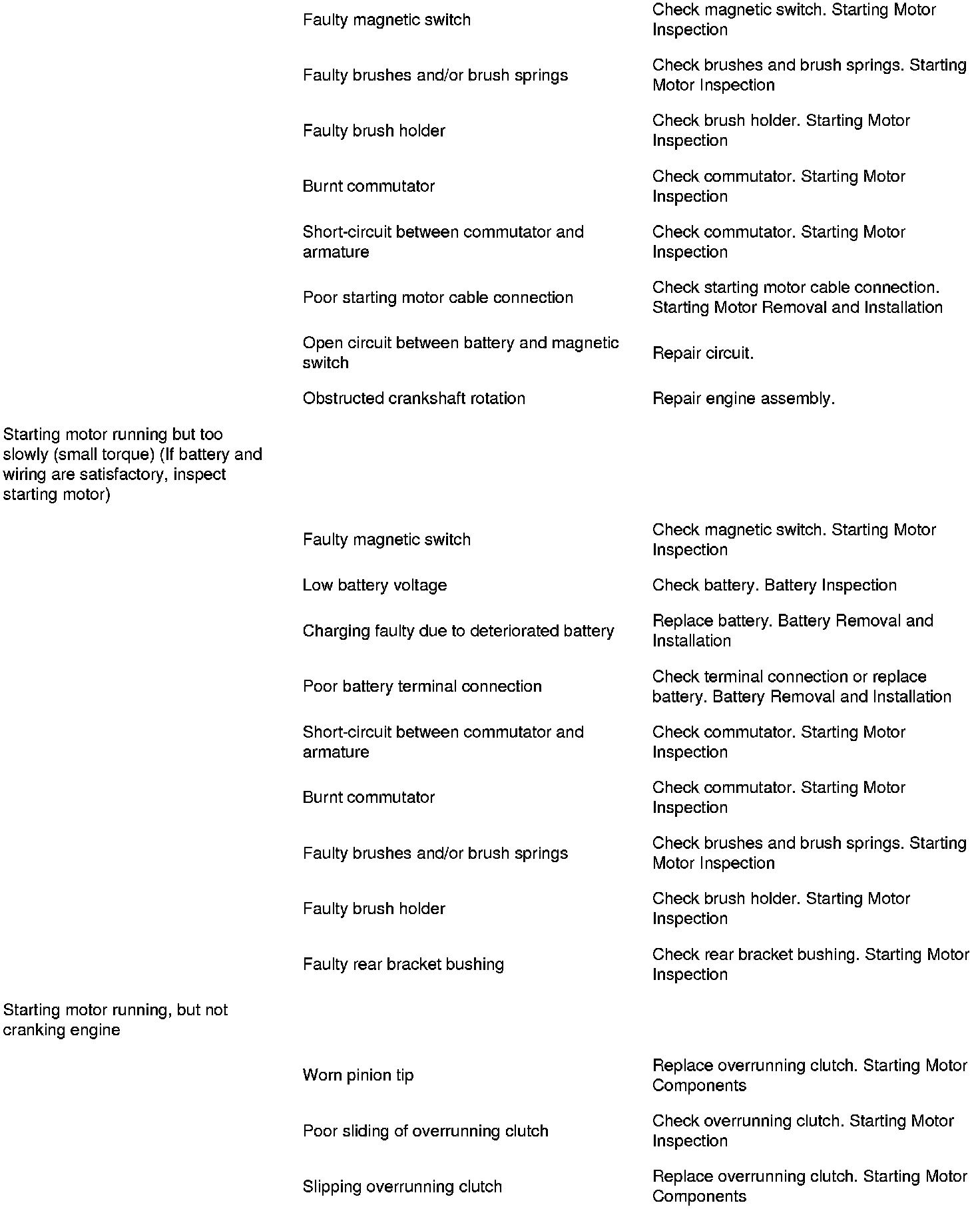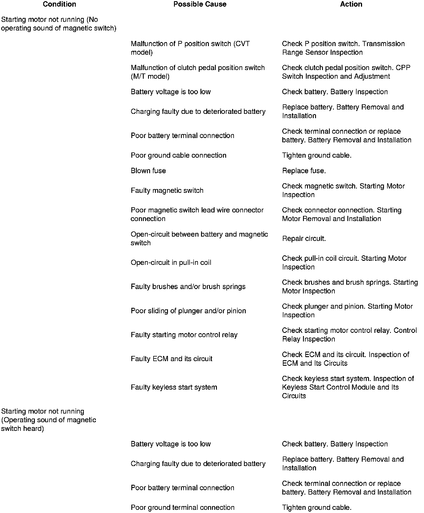 Before removing the starting motor to perform inspection, check the following items to narrow down the possible causes of trouble.