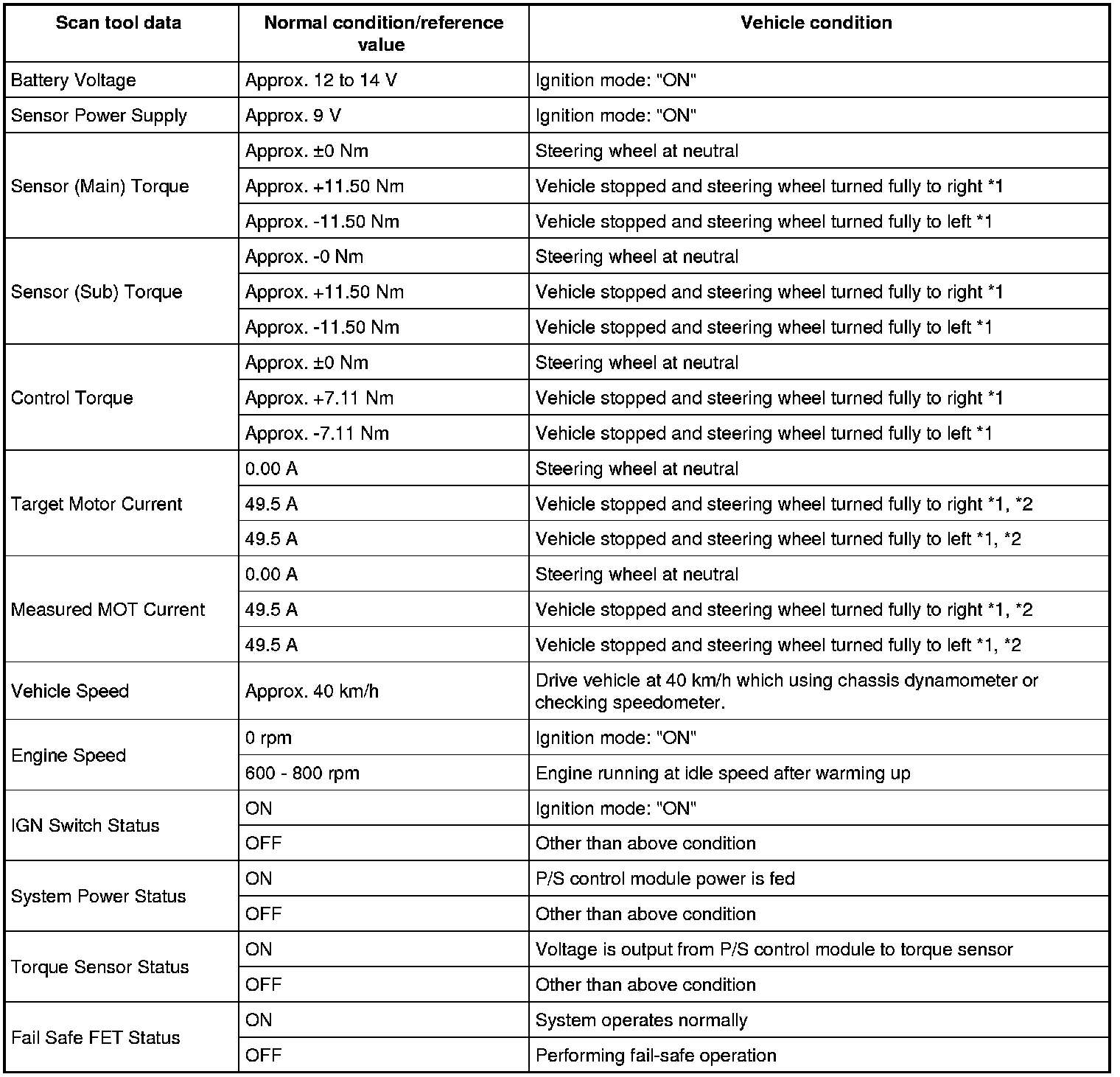 - *2: The voltage and current of motor decrease gradually after few seconds when steering wheel is turned.