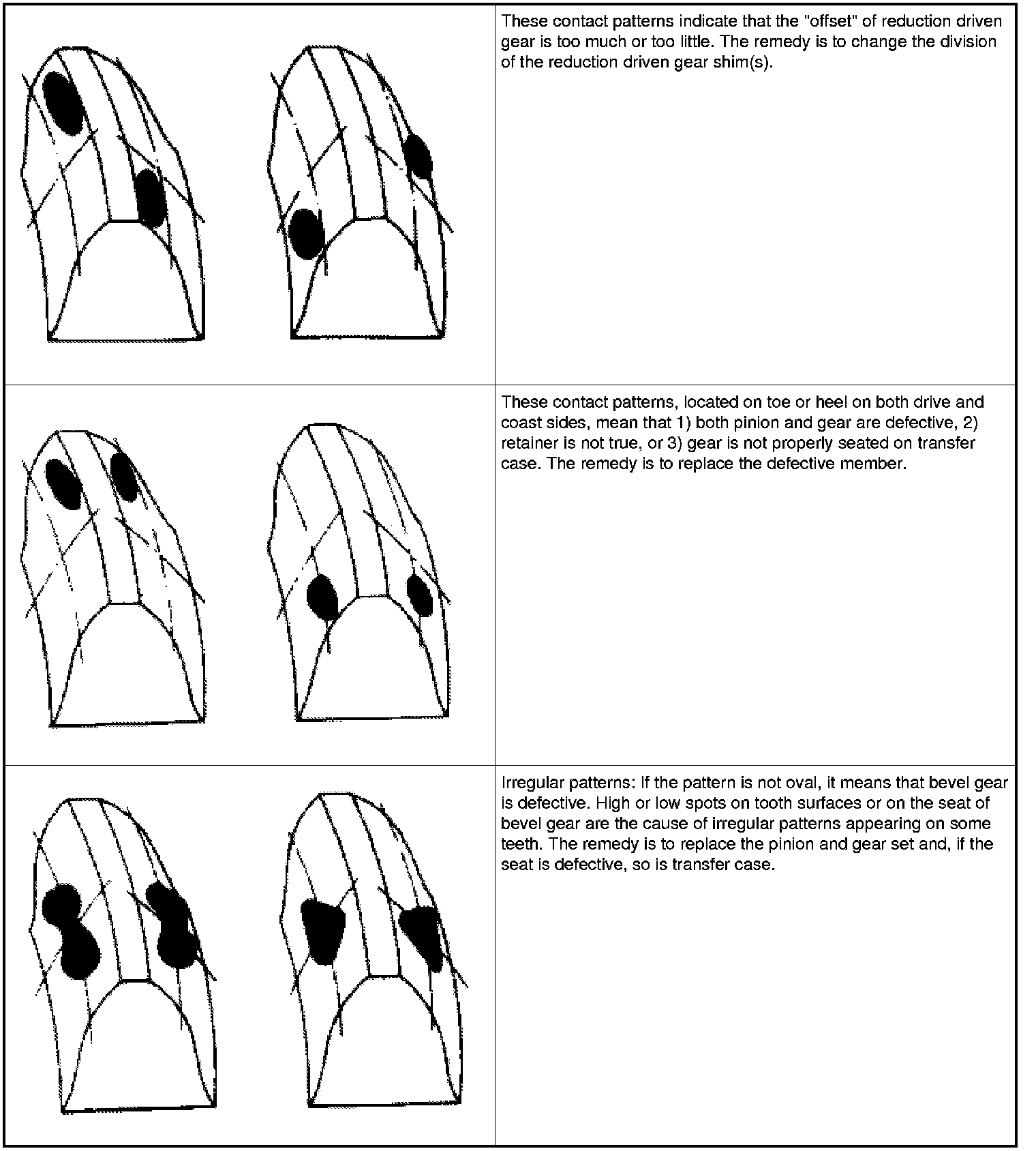 If correct tooth contact is not provided even when they are adjusted properly, however, there may be an abnormal condition in warm tooth, transfer case or retainer. Check each component and replace if necessary.