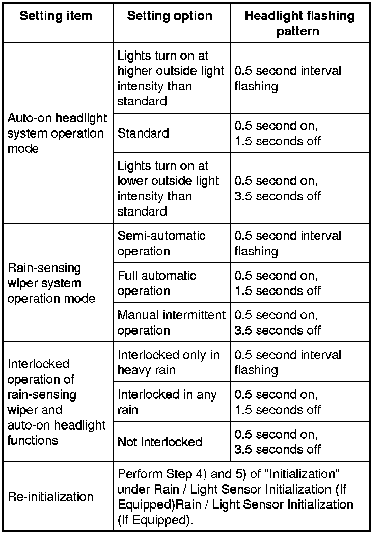On proceeding to setting change mode for selected setting item, headlights flash in pattern specific to current setting. Confirm current setting referring to the following table before starting setting change operation.