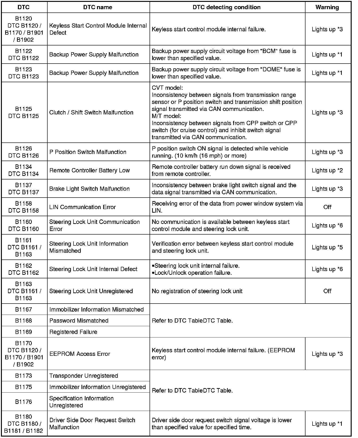 - *6: Immobilizer indicator light lights up. (It stays on for 15 minutes when steering lock fails, and for 5 seconds when steering unlock fails and ignition mode is in mode other than "ON". Stays on continuously when ignition mode is in "ON"). "SERVICE STEERING LOCK SYSTEM" or "TRN. STEERING WHEEL TO RELEASE LOCK" is shown in Information display.