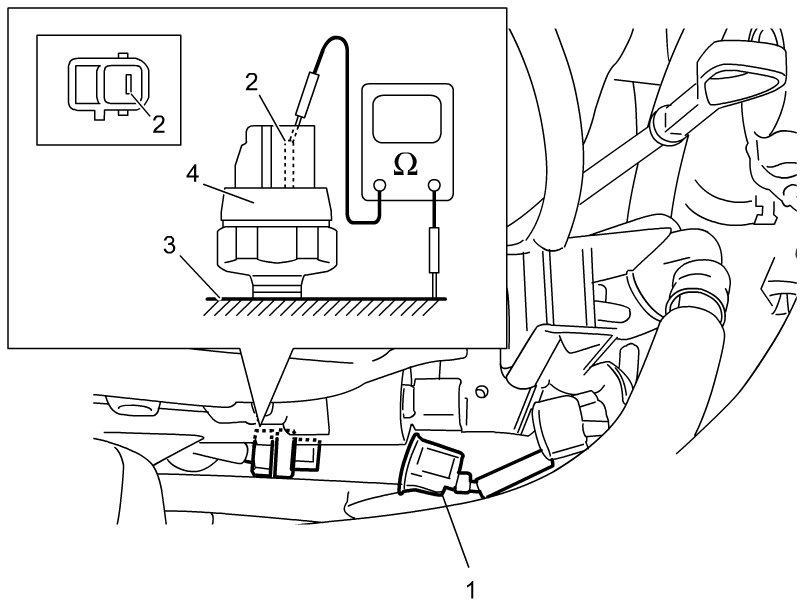 2) Check for continuity between oil pressure switch terminal (2) and cylinder block (3) as shown.