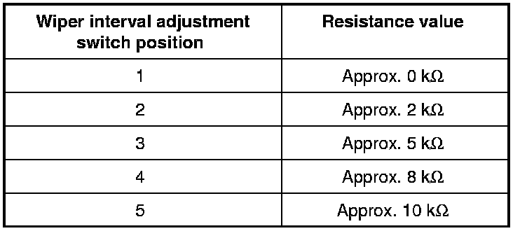 Check resistance between terminal "9" and terminal "12" with adjustment knob (6) set at each position. If check result is not as specified, replace wiper and washer switch.