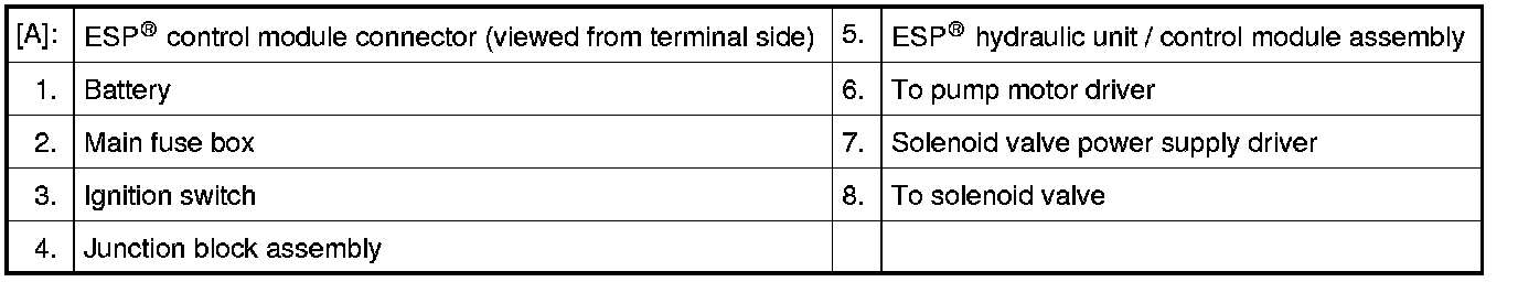 When the ignition switch is turned ON, power supply is supplied to ESP(R) control module. And, power supply is supplied to pump motor and solenoid valve in other line by the switching function in ESP(R) control module.