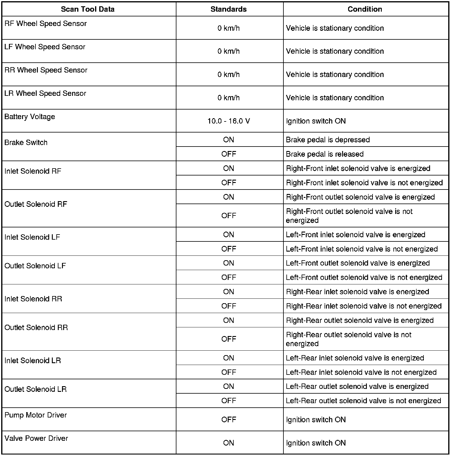 Outlet Solenoid RF, Outlet Solenoid LF, Outlet Solenoid RR, Outlet Solenoid LR (ON, OFF)