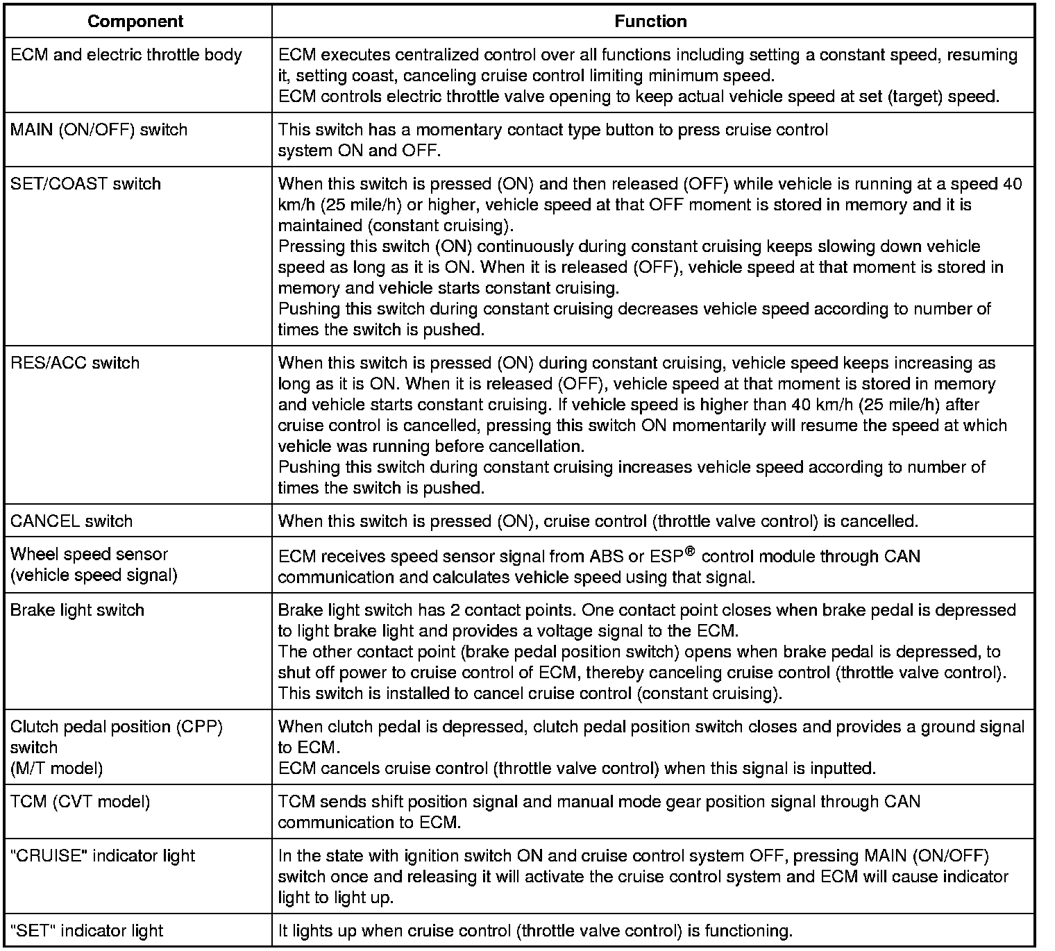Description of Cruise Control System Components and Functions