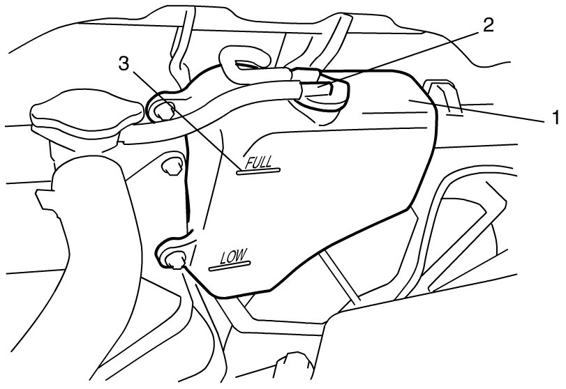 1) Fill reservoir (1) with coolant up to FULL mark (3).