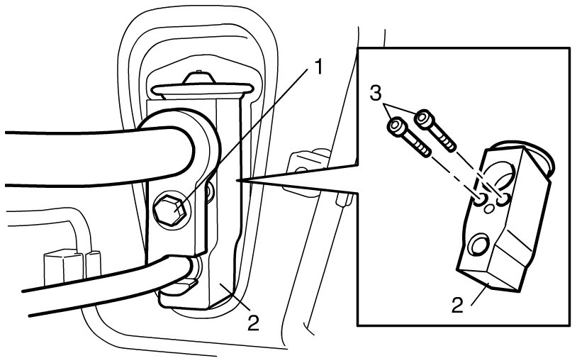 2) Loosen a bolt (1) and remove pipes from expansion valve (2).