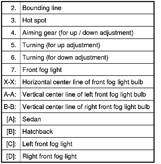 - Unless otherwise obligated by local regulations, adjust front fog light aiming according to the following procedure.