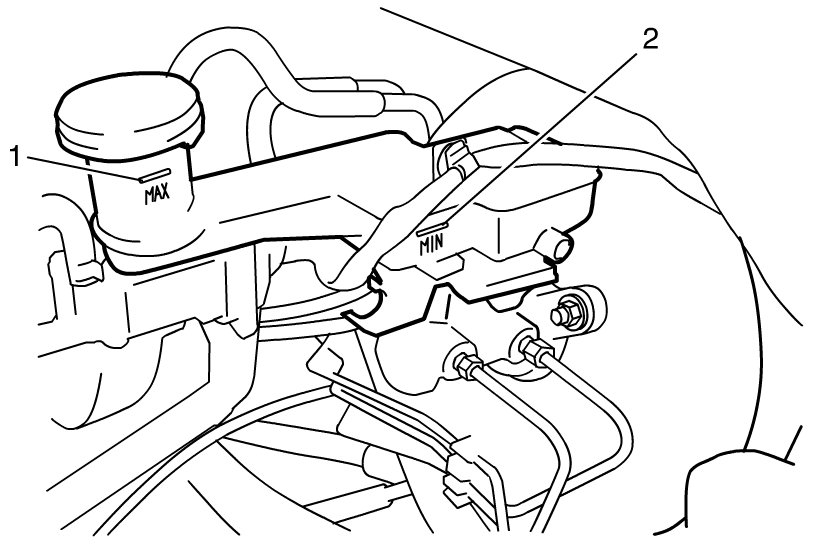 2) Check that brake fluid level is between MAX (1) and MIN marks (2) on reservoir.