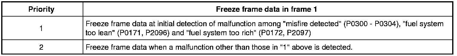 Shown in the table below are examples of how freeze frame data are stored when two or more DTCs are detected.
