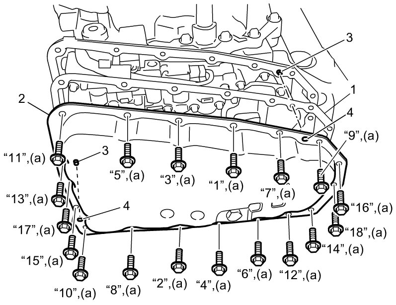 Tighten CVT oil pan bolts in numerical order ("1" - "18") evenly and gradually to specified torque.