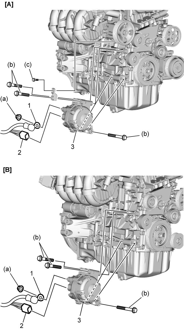 4) Disconnect "B" terminal wire (1) and connector (2) from generator (3).